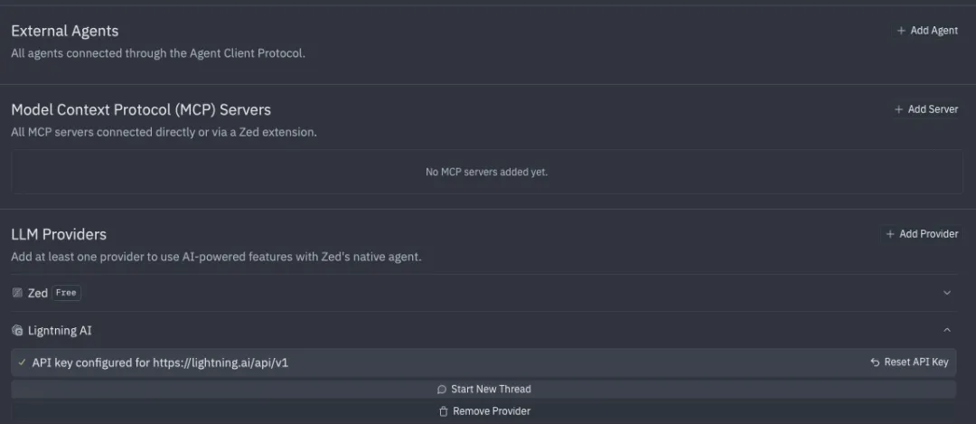 Zed 编辑器默认集成了常用大语言模型的配置端口(如 OpenAI、Anthropic 等)。若需使用其他模型,例如本地部署的模型,只需进行简易配置即可。本文以 Lightning AI 为示例,演示如何在 Zed 编辑器中配置兼容 OpenAI 的 API。读者亦可按照此步骤,配置其它类型的 API或者自己部署的本地模型,并在设置文件(settings.json)中指定对应的模型名称。
