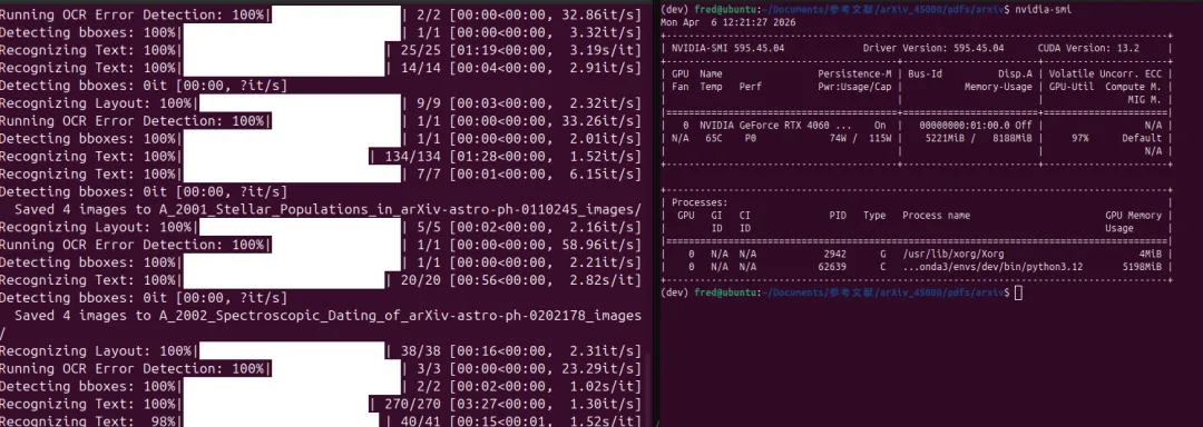 内存管理改了不少。加了自动显存检测,超过6GB空闲就用GPU,不够就CPU。低显存模式会自动调整batch size和量化级别。还有个disable-ocr-models参数,纯数字PDF不需要OCR的话,能省1.5GB显存。清理机制也加强了,CUDA内存溢出会自动重试,清理得更彻底。