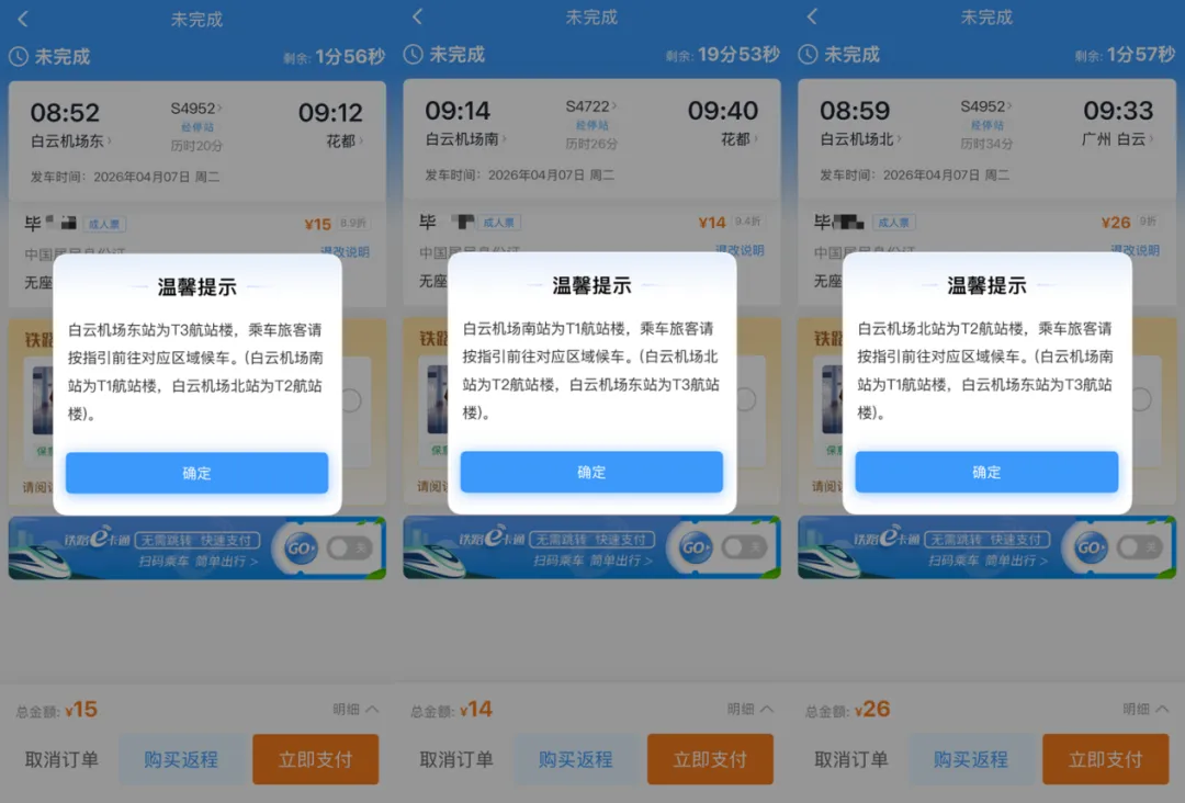 广州地铁还针对白云机场三座城际铁路车站的指引服务进行了优化,为方便旅客辨识白云机场三个航站楼、避免“误乘误下”,在铁路12306系统购票界面上线了提示功能。旅客在购买出发或到达城际白云机场东站(T3)、白云机场南站(T1)、白云机场北站(T2)的车票时,系统将在支付前自动弹出提示框,提醒所对应的具体航站楼信息。同时,广州地铁APP也同步优化了地图和“城际出行助手”中的站名显示,新增T3、T1、T2航站楼标注,方便旅客选择合适的车站。
