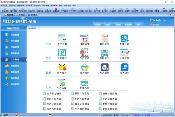中小厂员工文化水平参差不齐,易特ERP界面无专业术语,按钮少、步骤简,出入库、报工、领料都是 “点选 – 录入 – 保存” 三步搞定,中老年工人也能快速上手,不用花时间培训。 - 生产功能强,全流程闭环