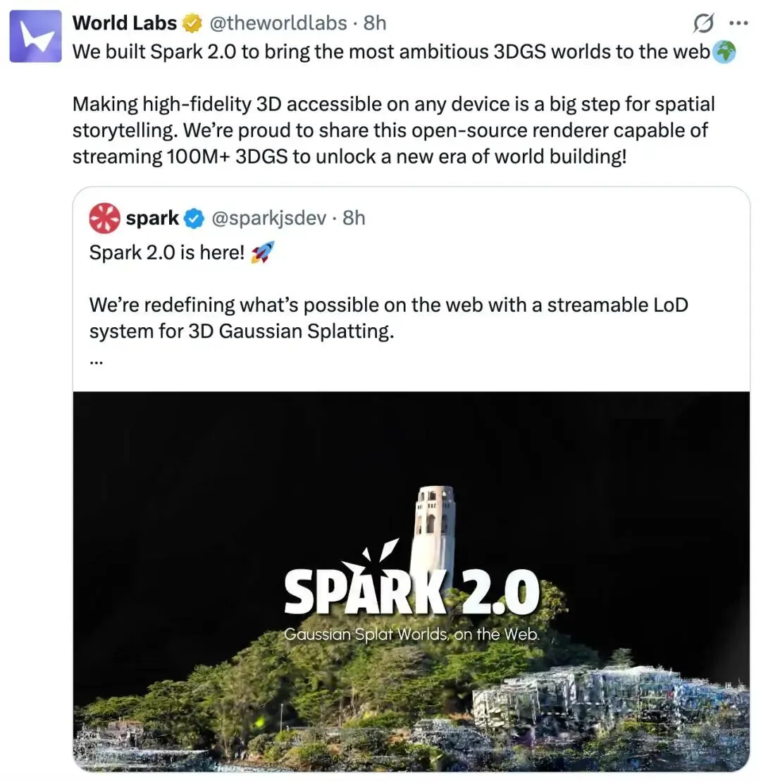 4月15日消息,就在今天凌晨,李飞飞空间智能独角兽公司 World Labs 官宣推出「Spark 2.0」,将最具野心的 3DGS(3D 高斯泼溅)世界带入到 Web。