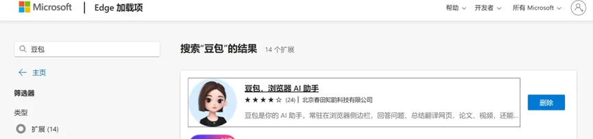 以 Microsoft Edge浏览器为例,点击浏览器右上角的“…”符号,打开菜单,点击“扩展”,再点击“获取 Microsoft Edge扩展”,搜索框中输入“豆包”,点击安装。