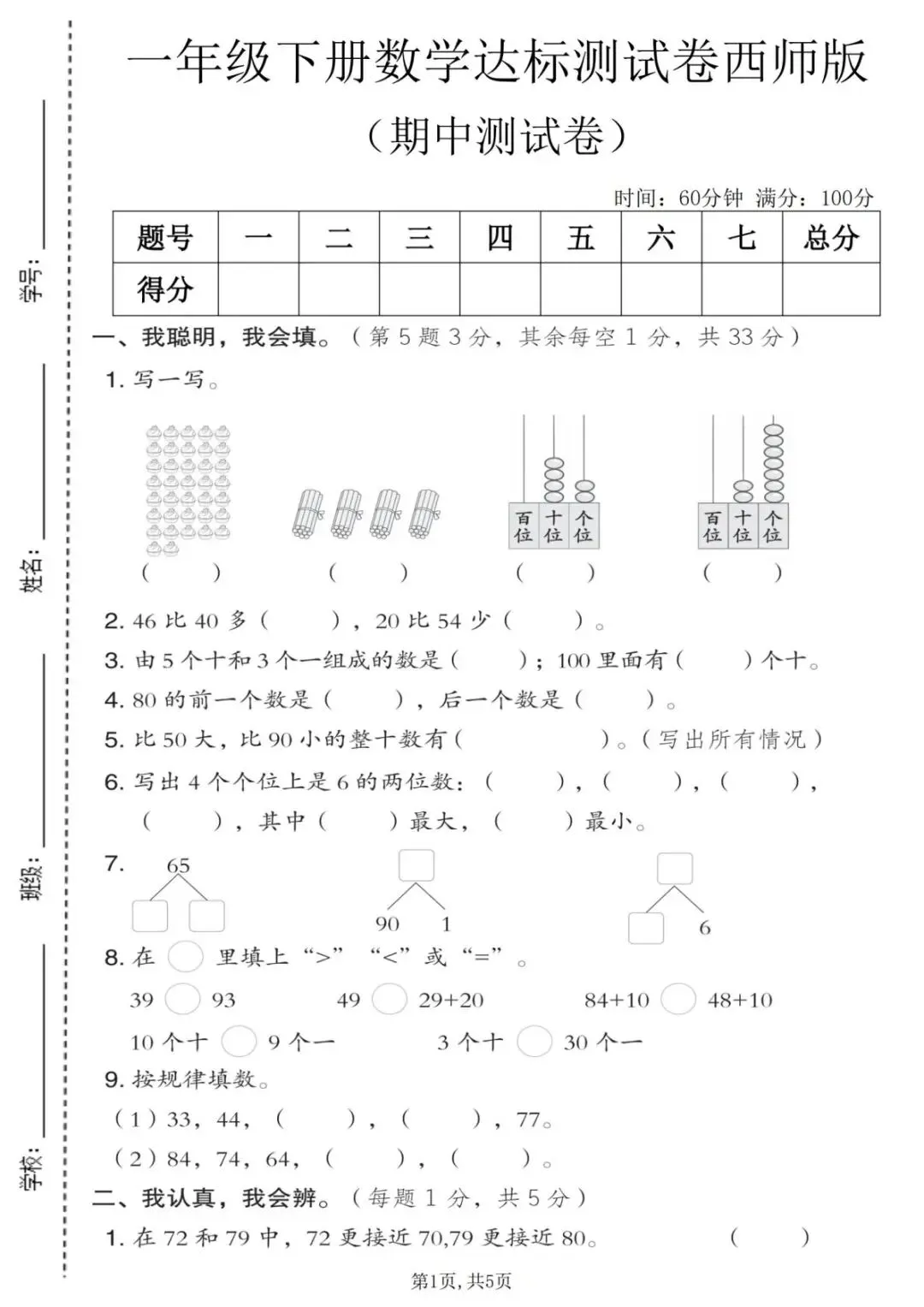 一年级(下)数学 期中达标测试卷《西师版》