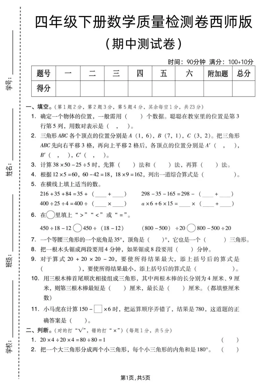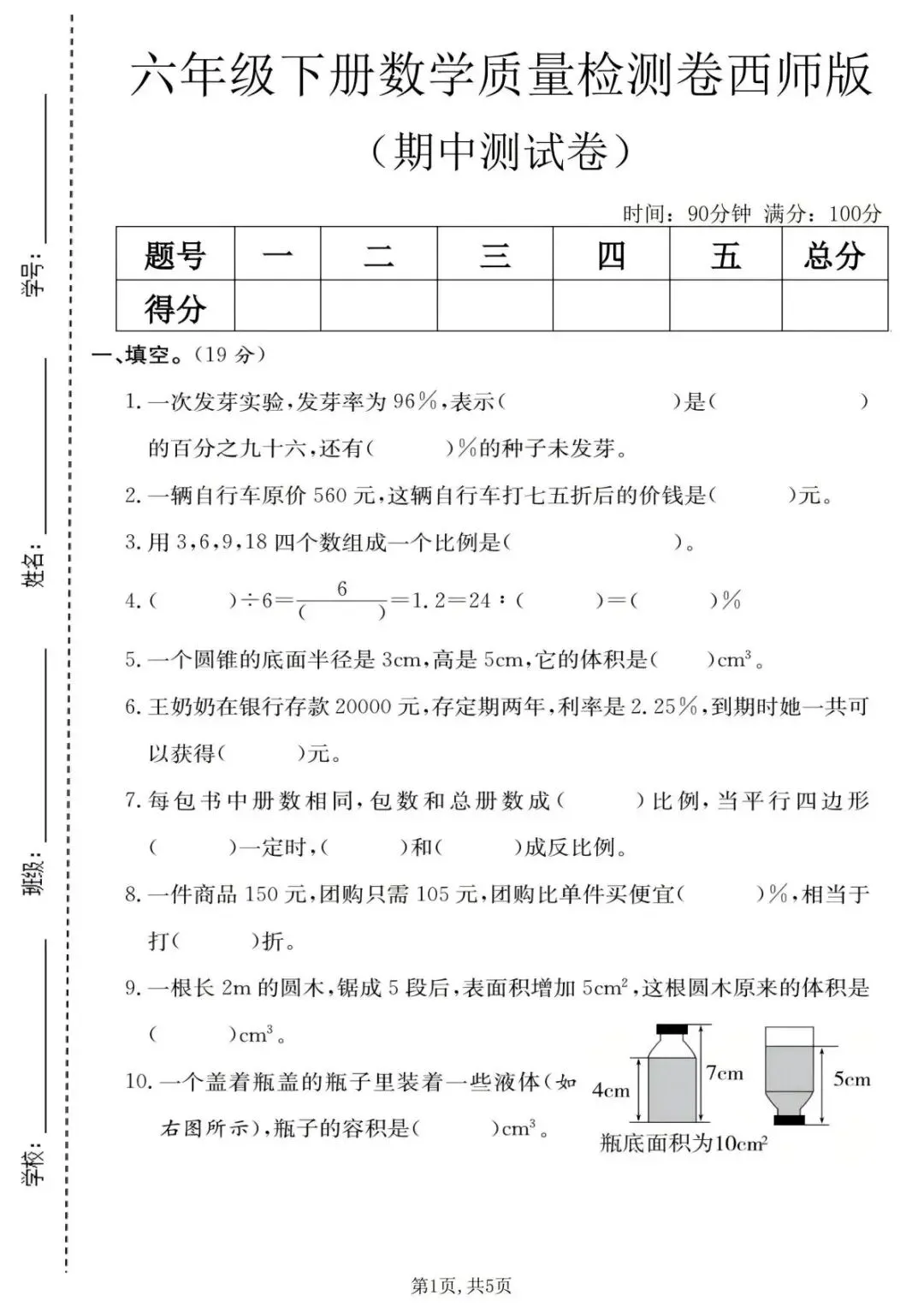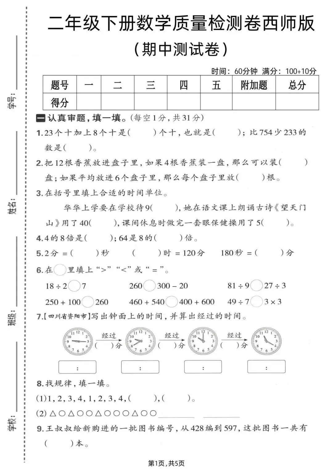 西师版2026春一二三四五六年级下册数学期中考试测试卷,带答案,网盘永久保存,可下载打印,免费领取.