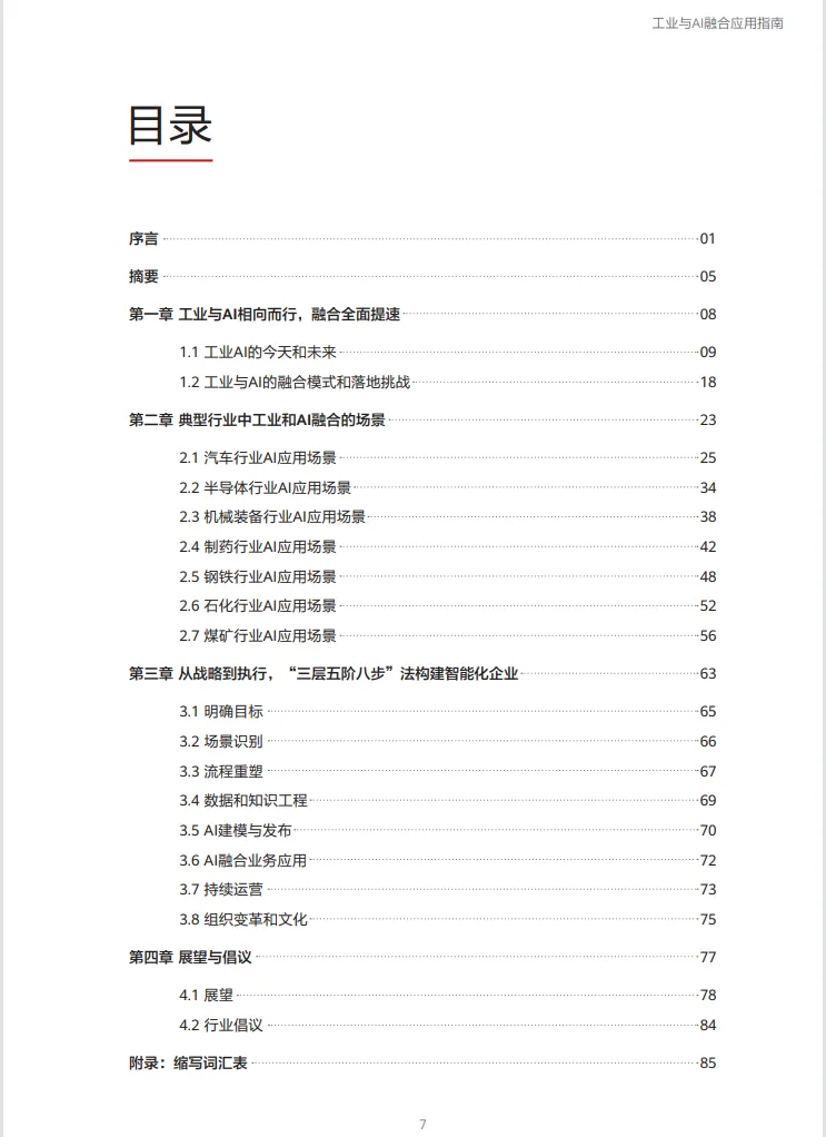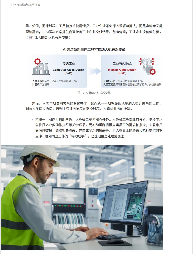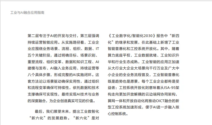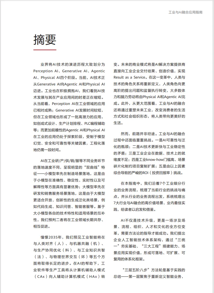 在全球产业格局发生深刻变革的当下,工业作为国家综合实力的核心支撑,正经历着前所未有的转型升级。人工智能(AI)技术的迅猛发展为工业领域带来了新的机遇与挑战。工业与AI的深度融合,不仅是技术发展的必然趋势,更是实现工业高质量发展的关键路径。华为、中国信通院、清华大学人工智能研究院、罗兰贝格管理咨询公司联合编写的《工业与AI融合应用指南》全文发布,提出“新六化”工业发展趋势和“三层五阶八步”实施方法,为工业企业应用人工智能提供可落地的实践指导。