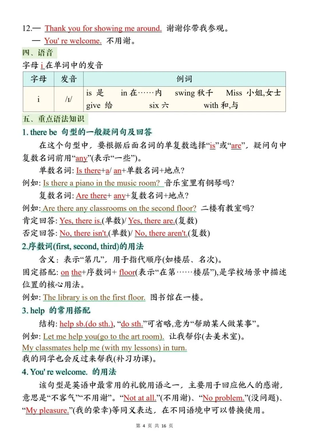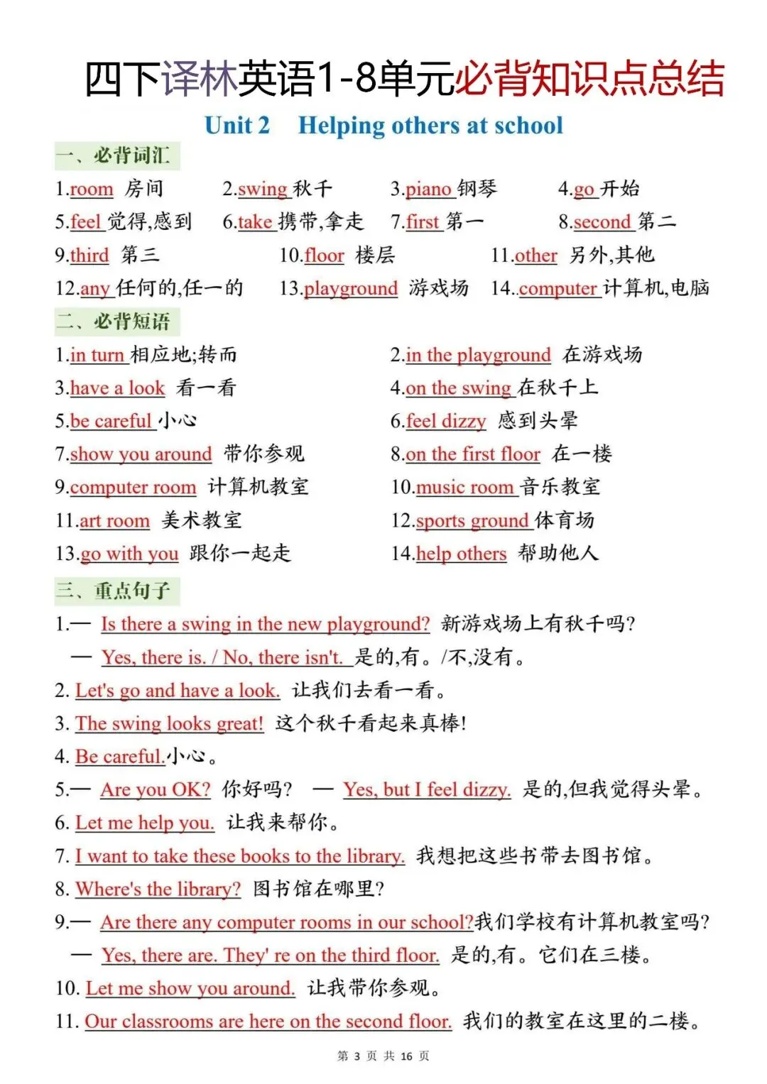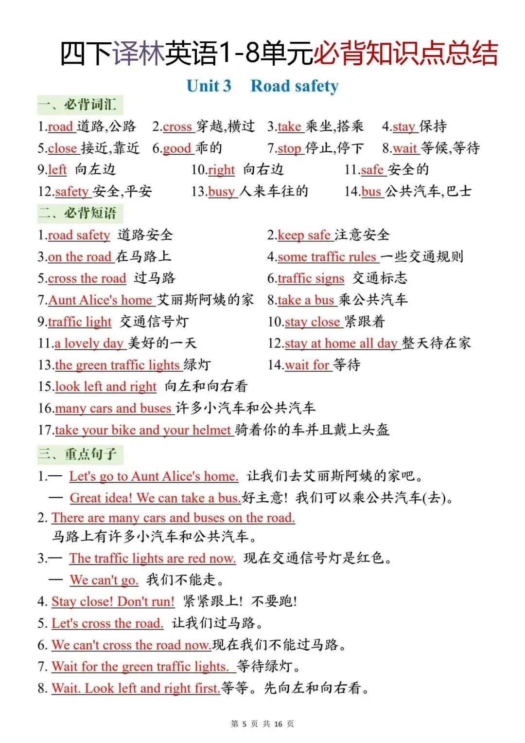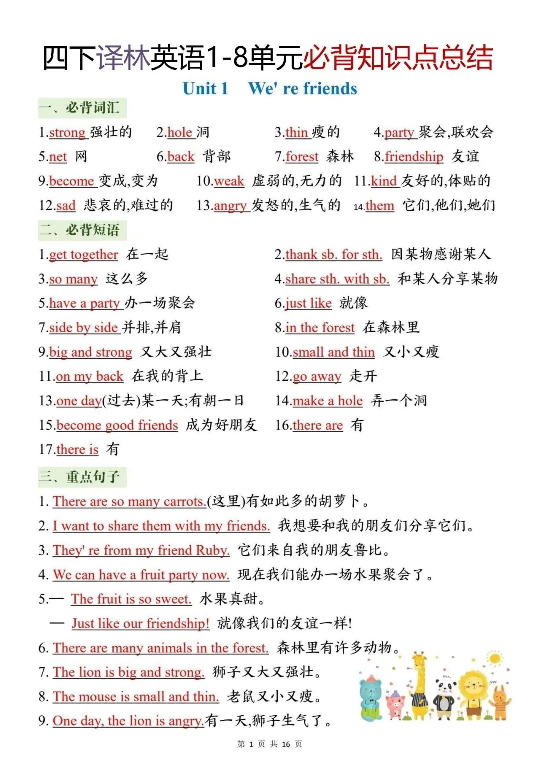 26春新四年级下册译林版英语《1-8单元必背知识点总结》 词汇+短语+句子 可打印