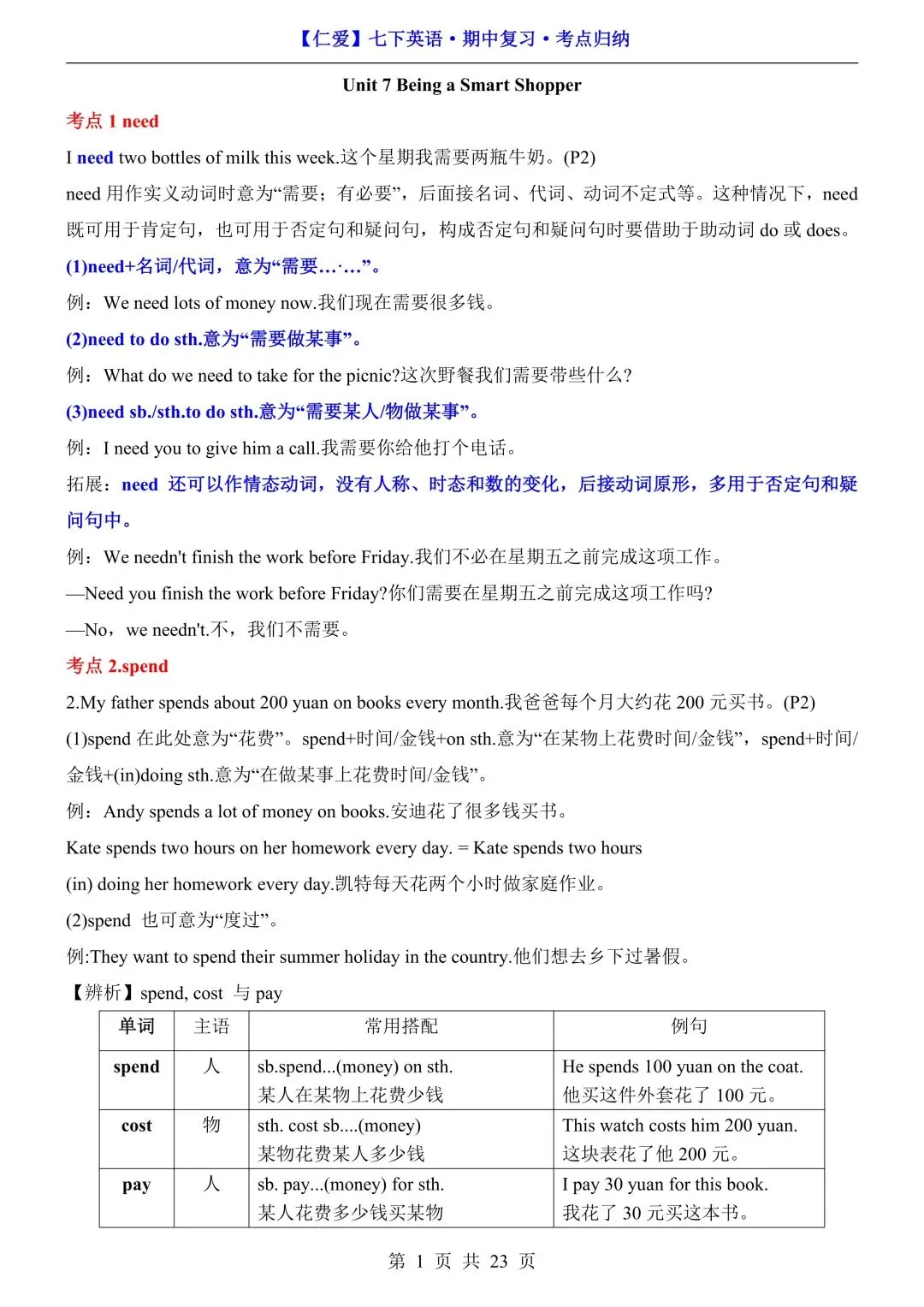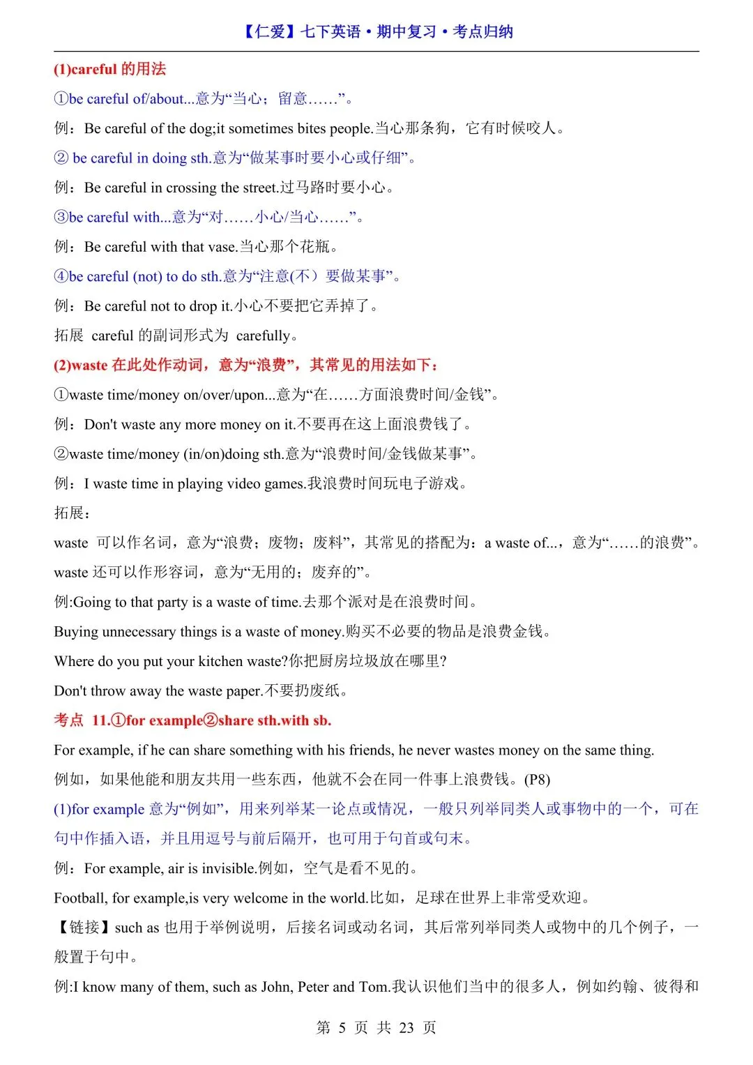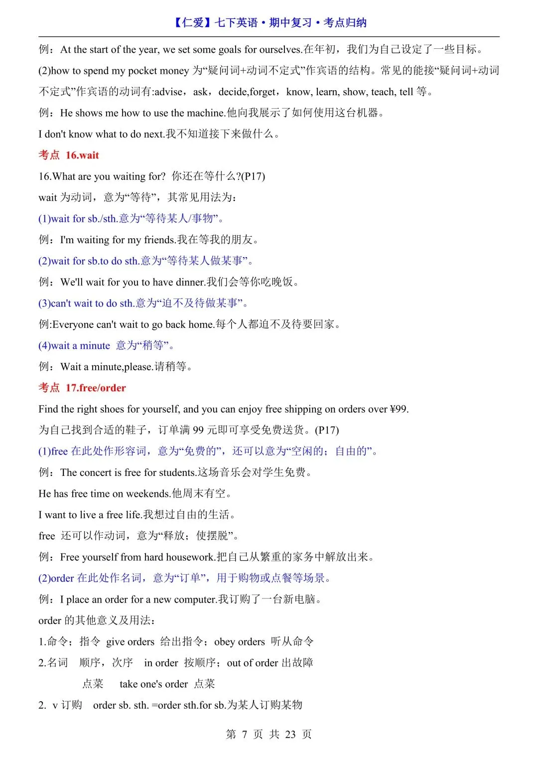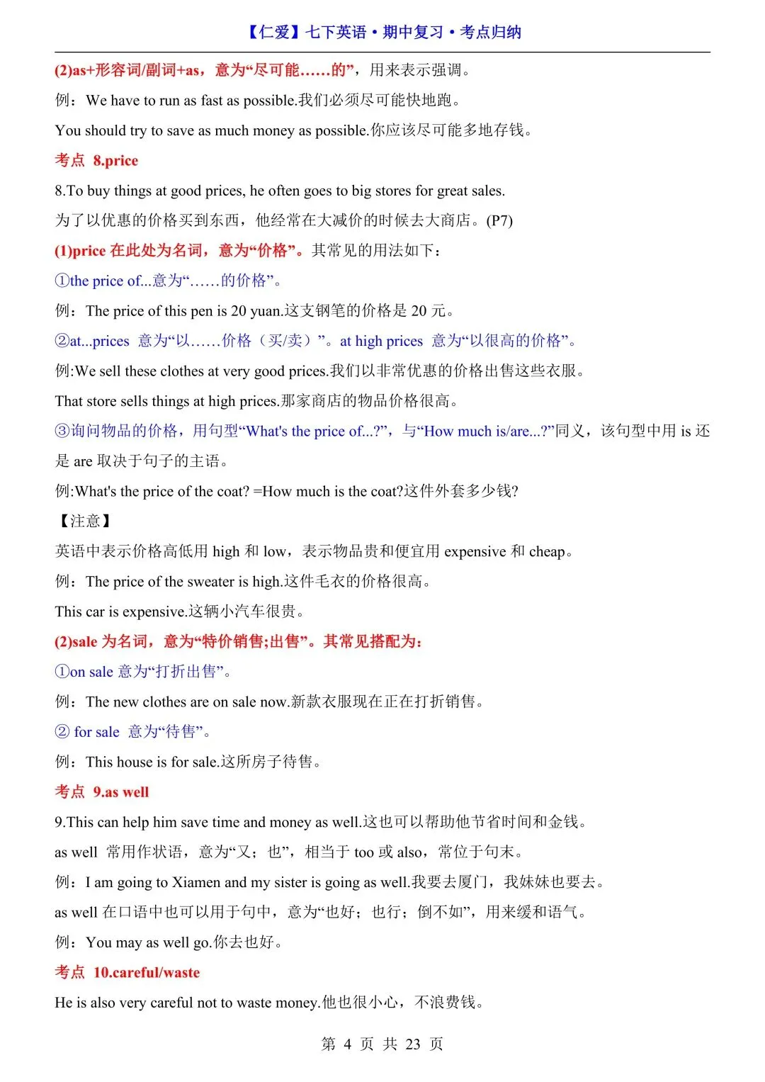 今天分享的是七年级下册语仁爱版英语《期中复习考点归纳》,大家可以按需自取,还可以分享到班级群或者朋友圈,我们一起助力孩子们高效学习。