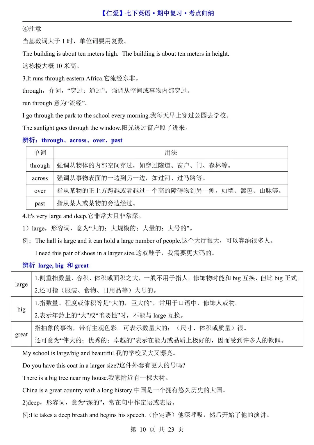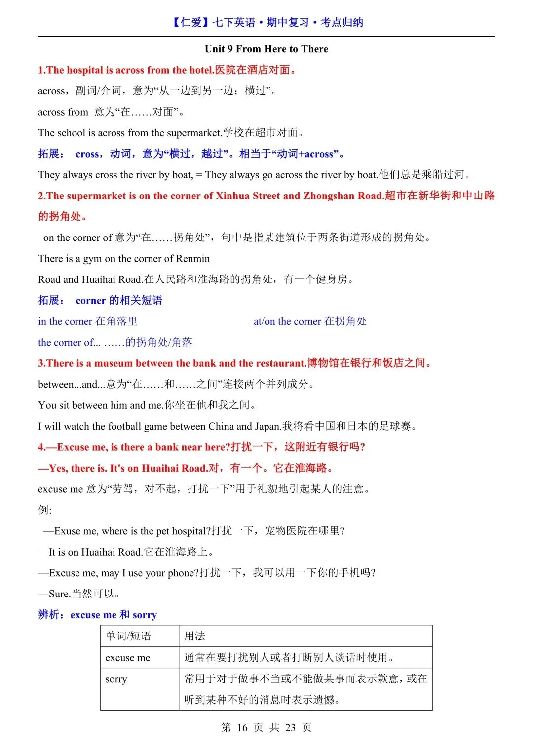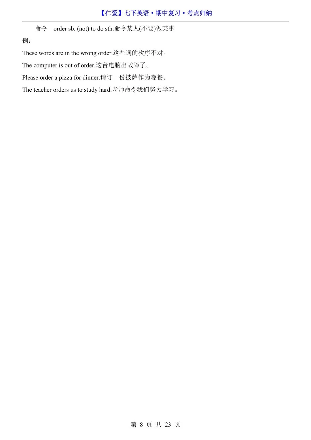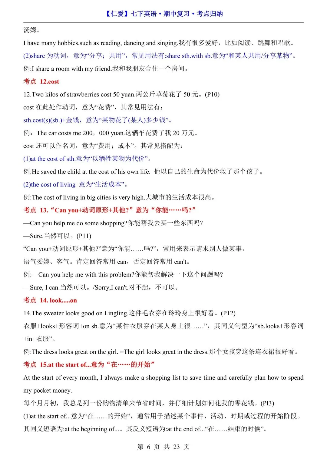 今天分享的是七年级下册语仁爱版英语《期中复习考点归纳》,大家可以按需自取,还可以分享到班级群或者朋友圈,我们一起助力孩子们高效学习。