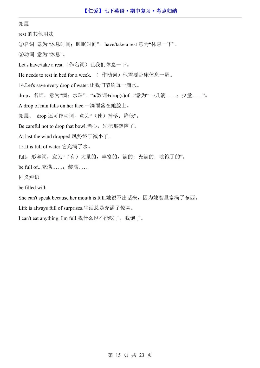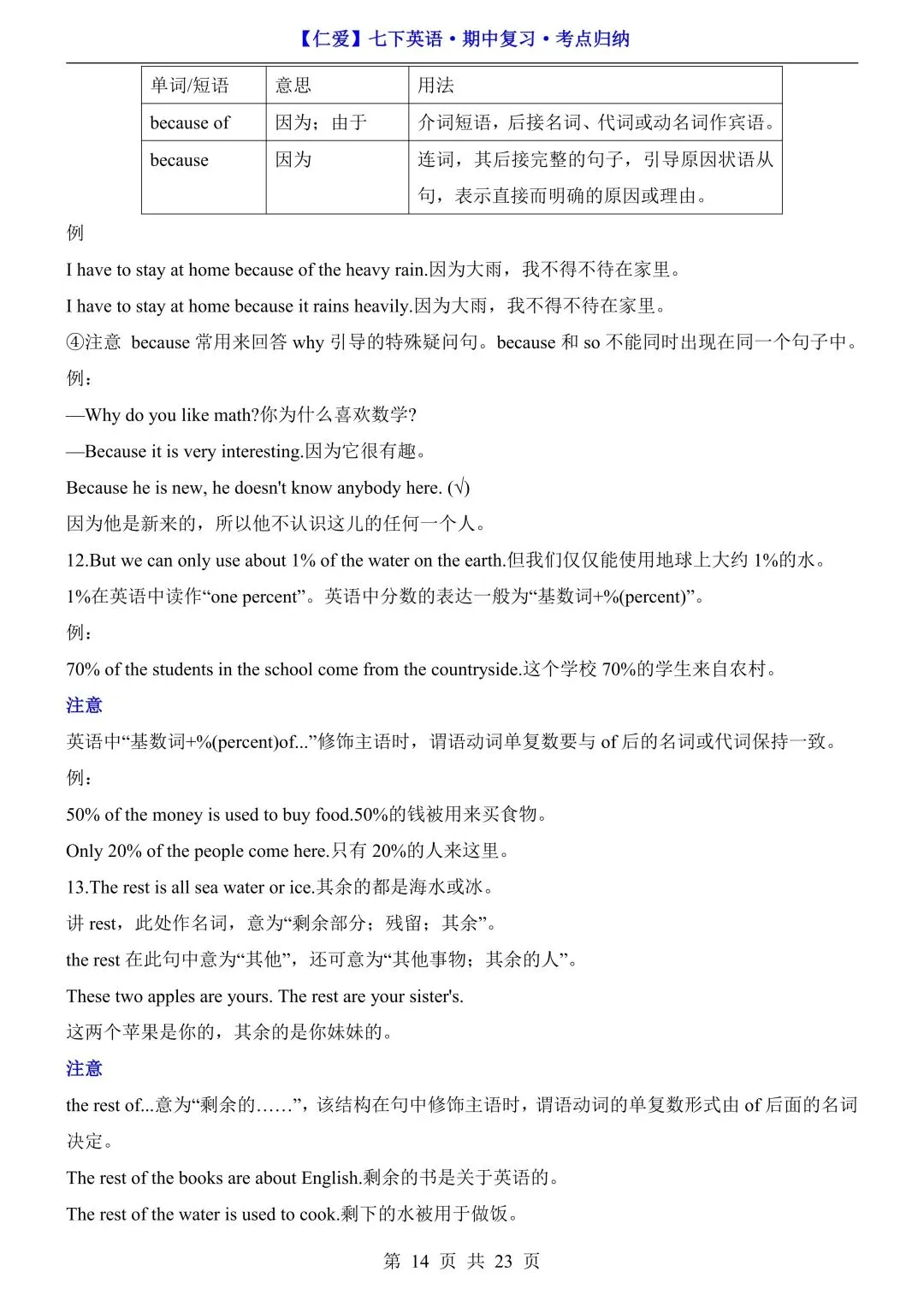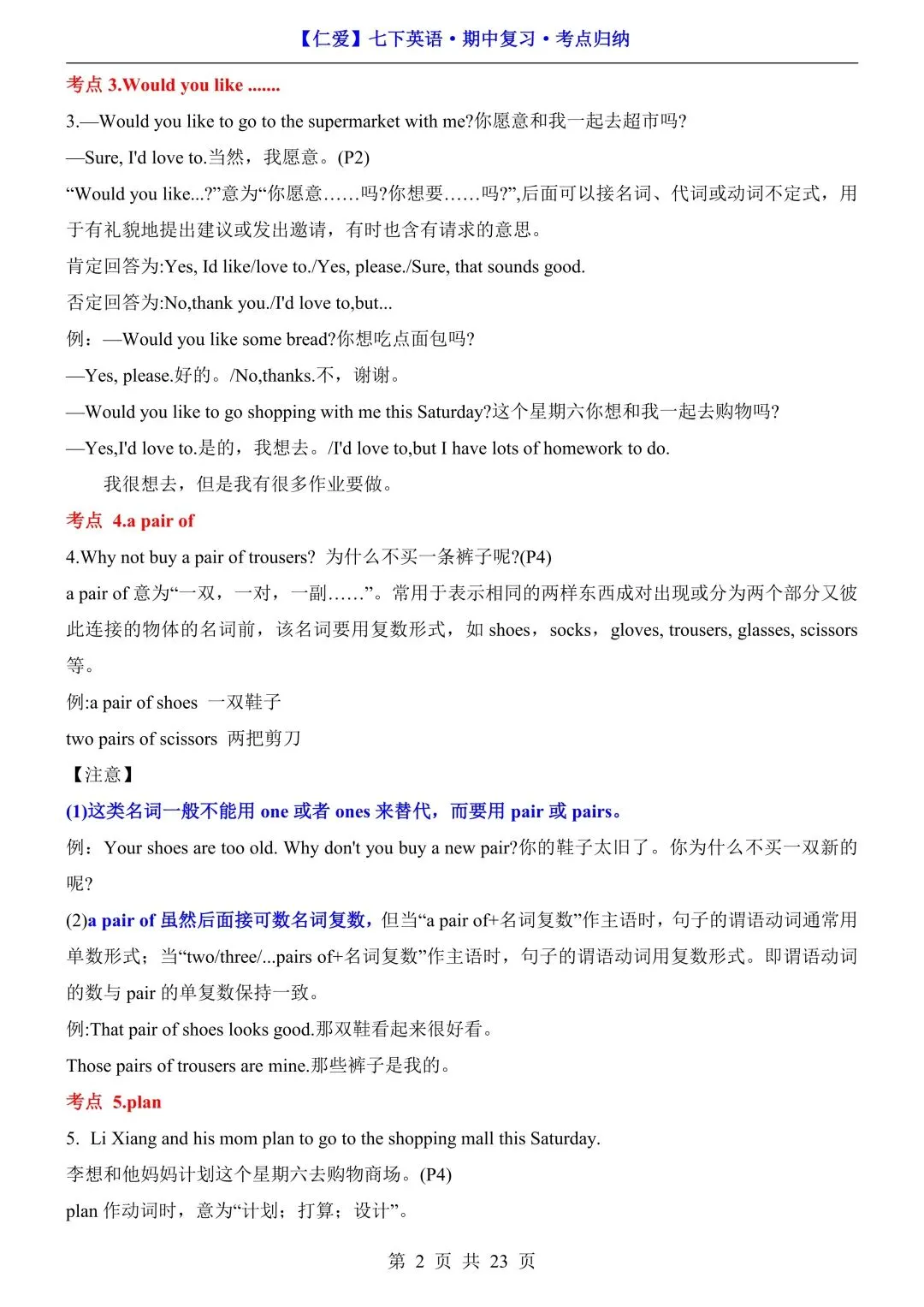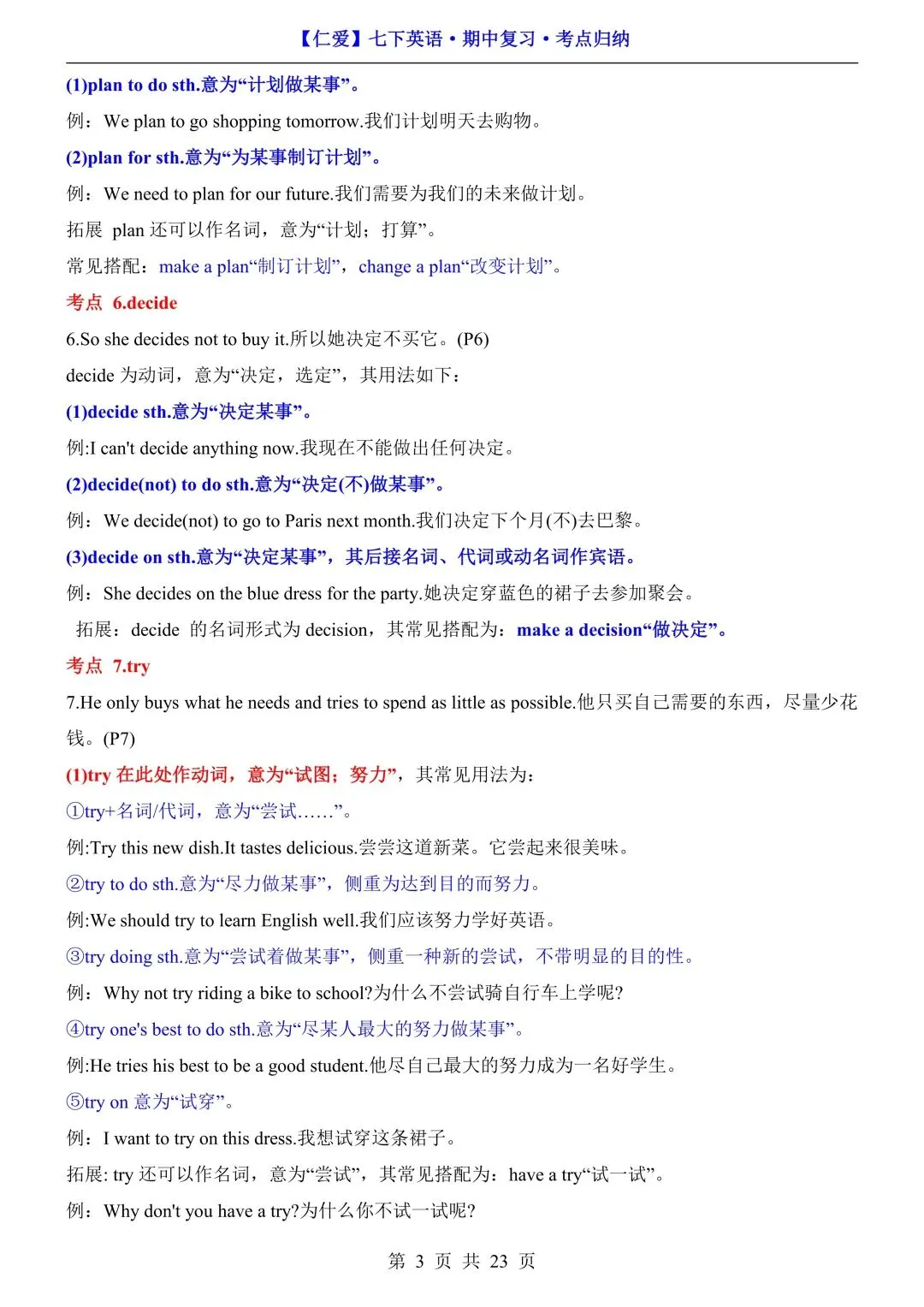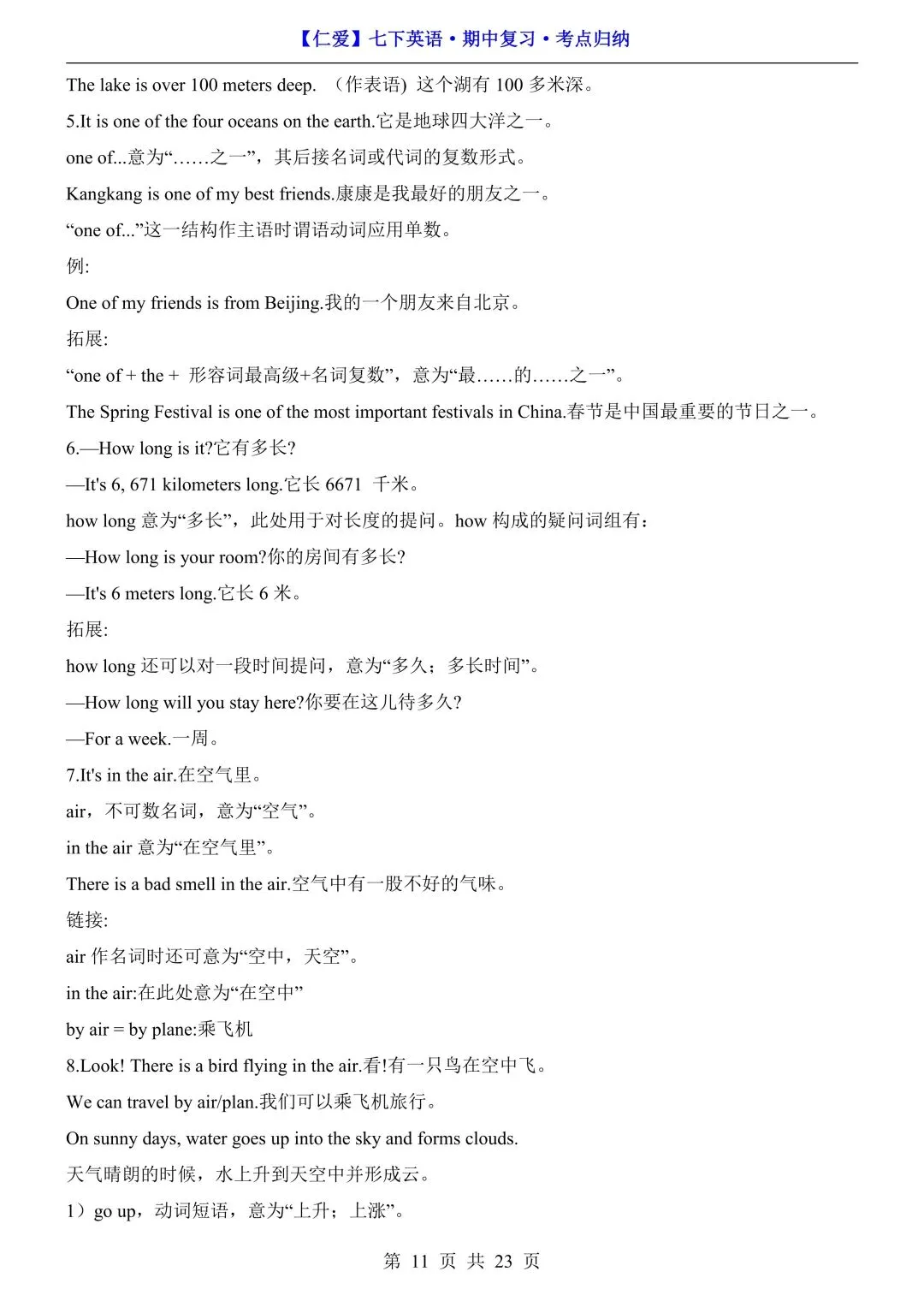 今天分享的是七年级下册语仁爱版英语《期中复习考点归纳》,大家可以按需自取,还可以分享到班级群或者朋友圈,我们一起助力孩子们高效学习。