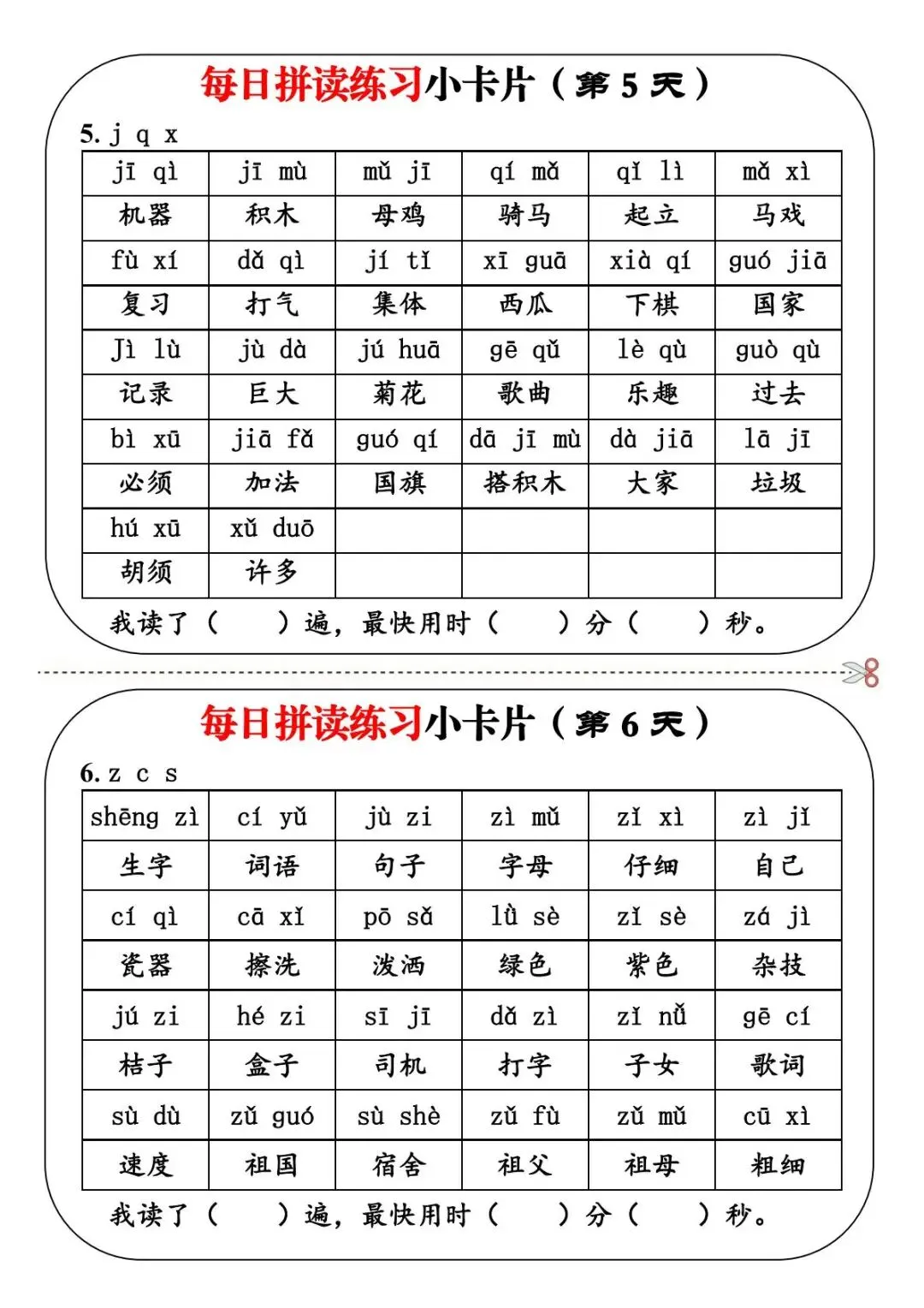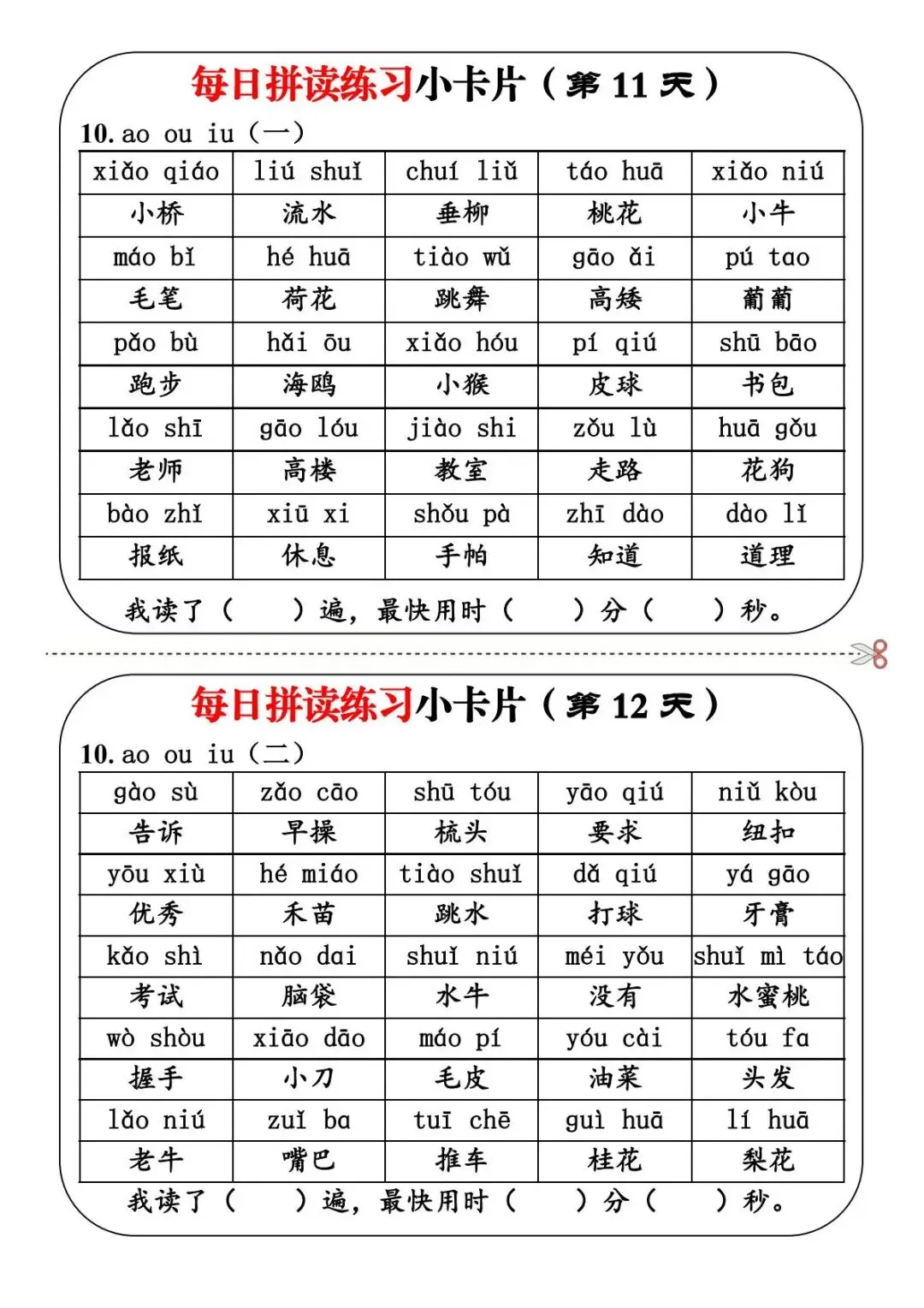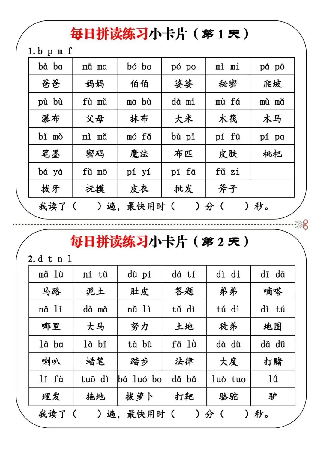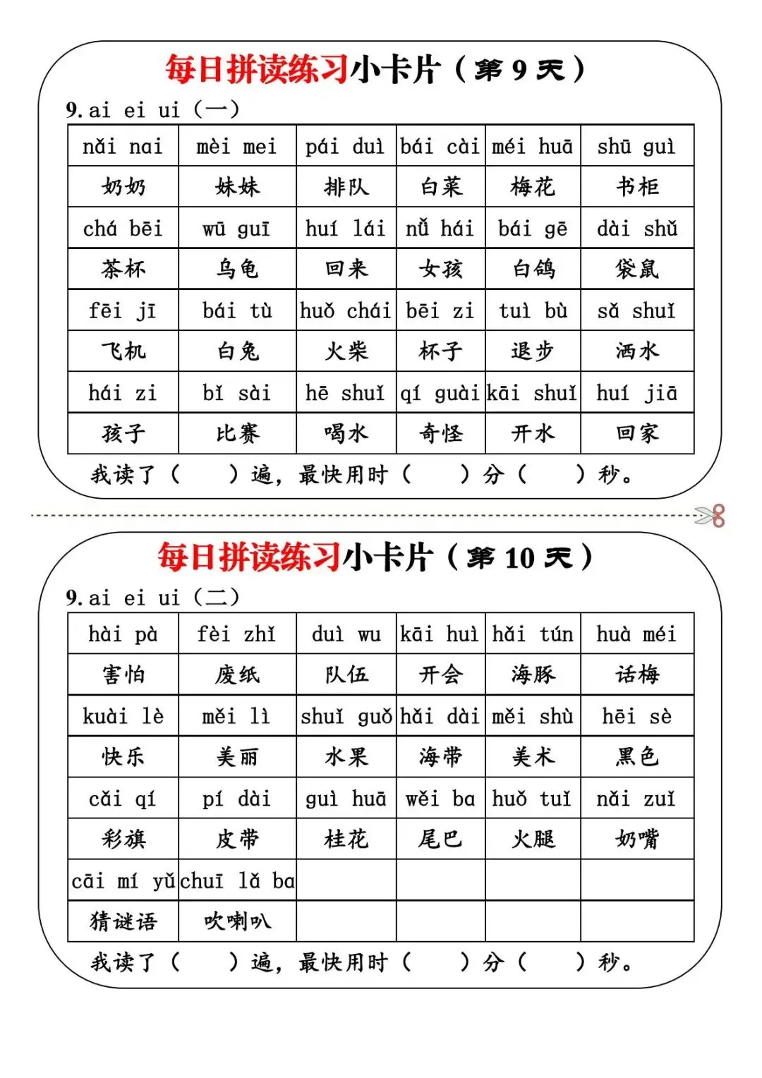 幼小衔接每日拼读练习小卡片,共10天,电子版可打印,每天练一练,帮助孩子攻克拼音难关,为一年级学习奠定拼音基础,开学学习更轻松,需要的家长们给孩子领取一份,读一读,练一练吧。
