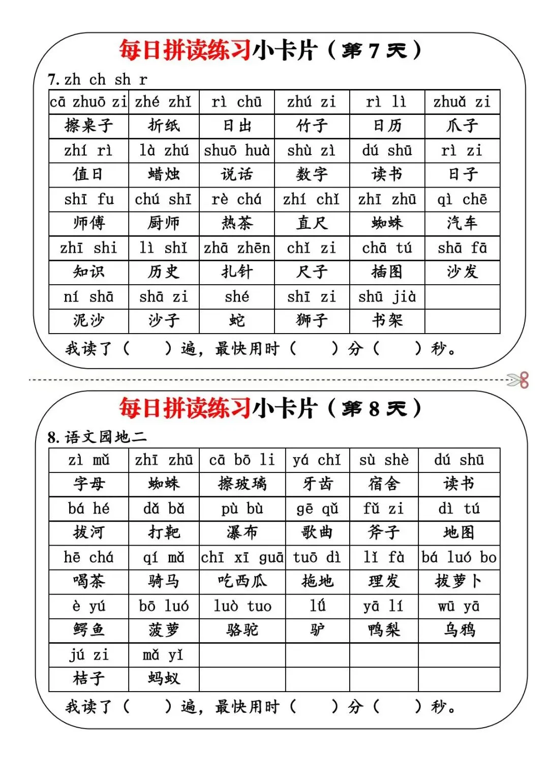 幼小衔接每日拼读练习小卡片,共10天,电子版可打印