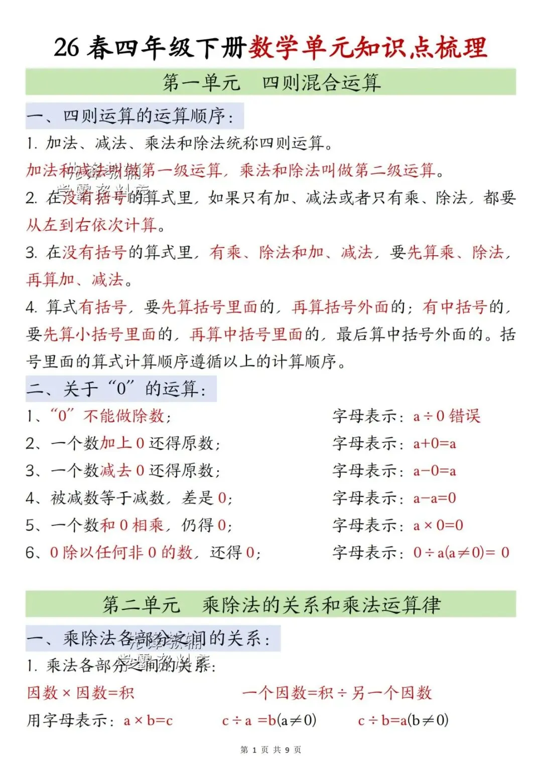今日分享26年春新版四年级下册西师版数学《1-8单元知识点梳理》,电子版可打印。家长可以打印出来让孩子每天作为晨读资料读一读、练一练,扎实课内基础知识,轻松夯实基础、突破弱电,让考前复习更省心!