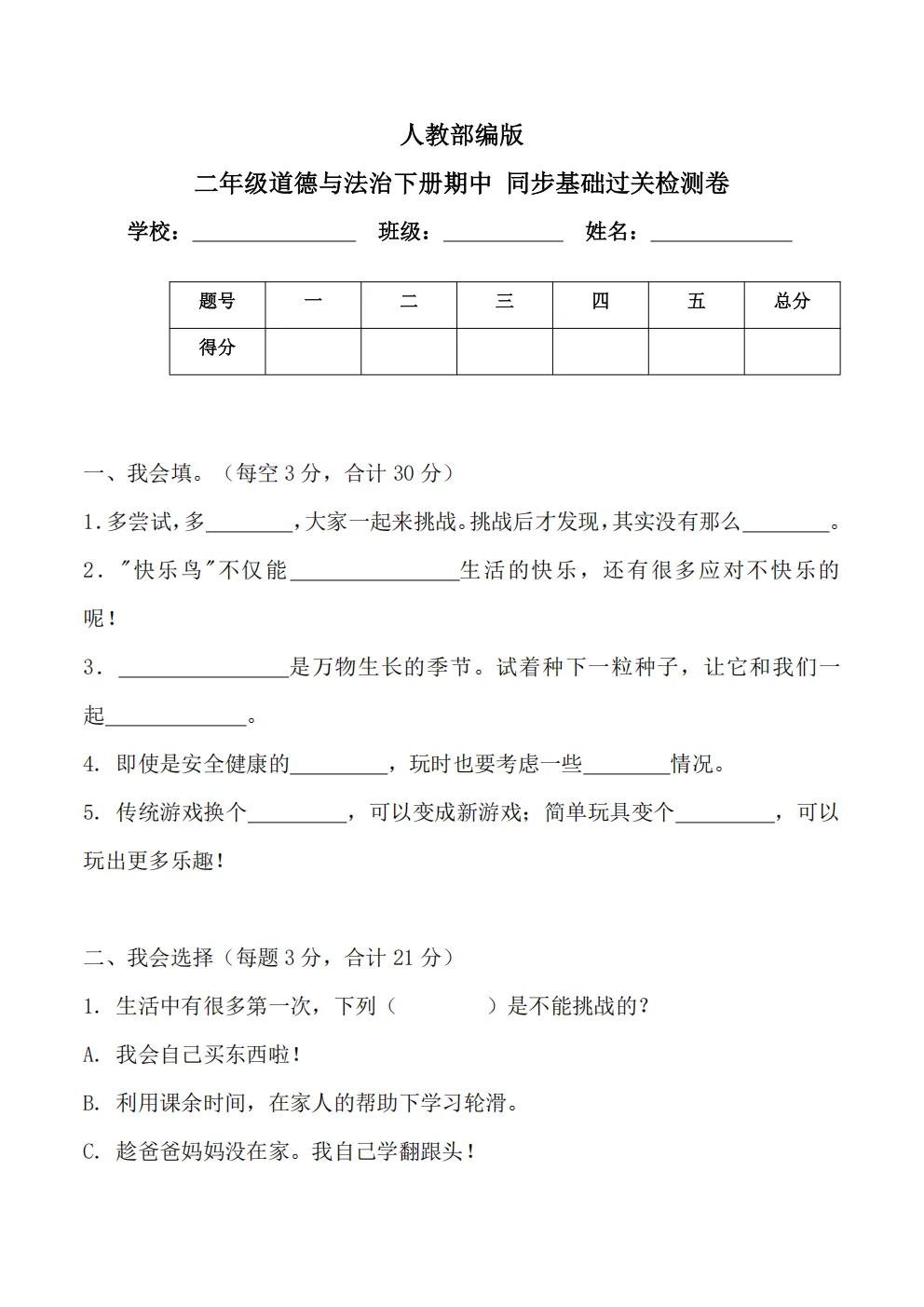 🌟今天给家长们分享的是26春二年级下册人教部编版《道德与法治期中测试卷》共2套(附答案)高清电子版可打印,需要的家长抓紧领取一份给孩子打印🖨️出来,让孩子练一练吧✍🏻欢迎分享到班级群或朋友圈,方便家长打印出来助力孩子高效学习!