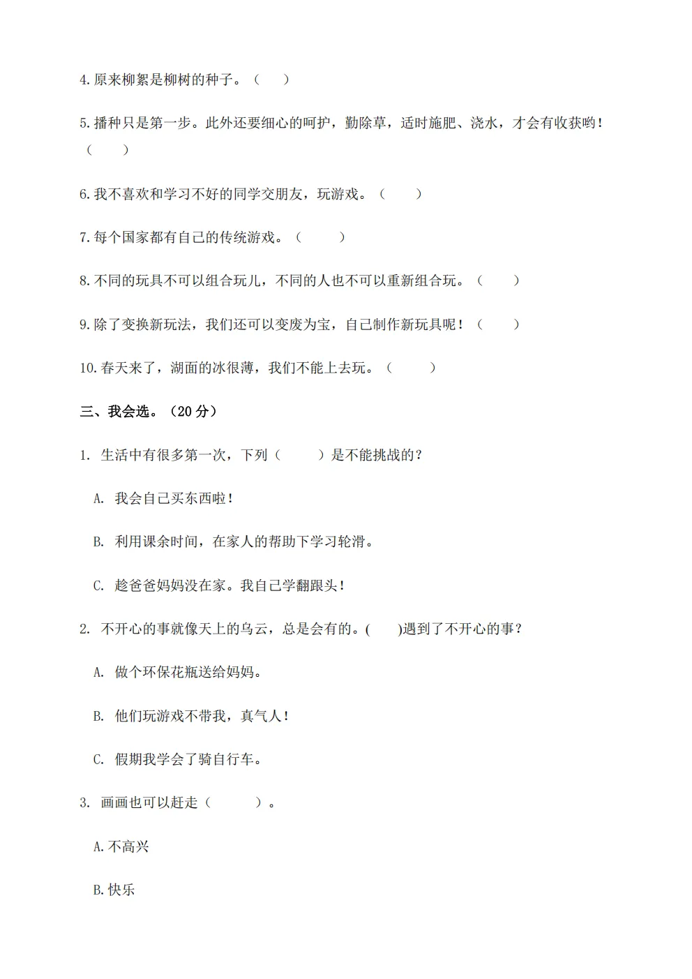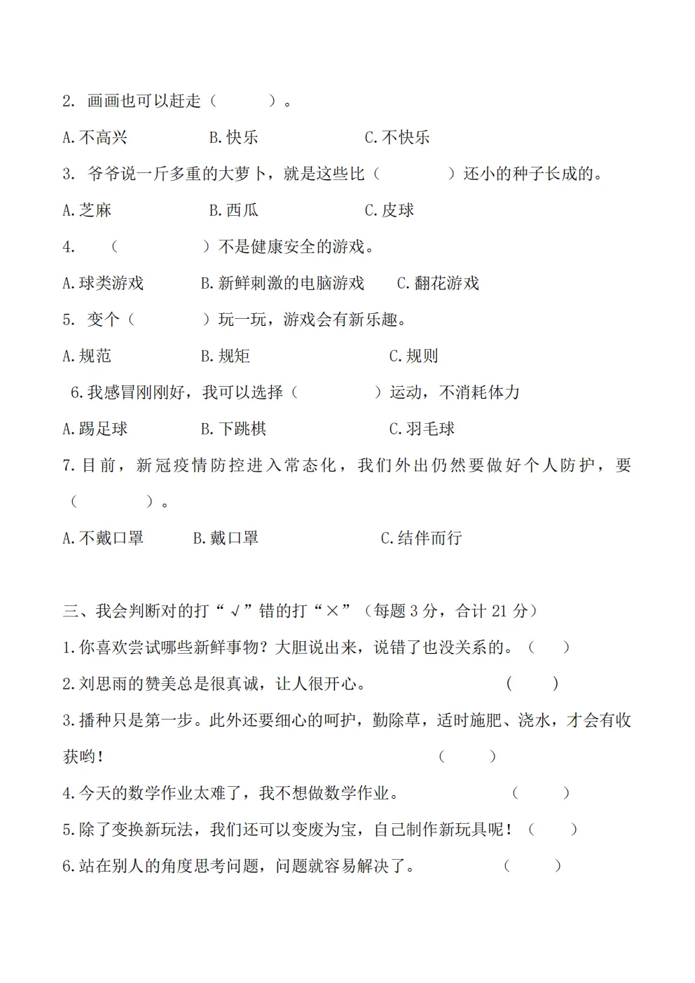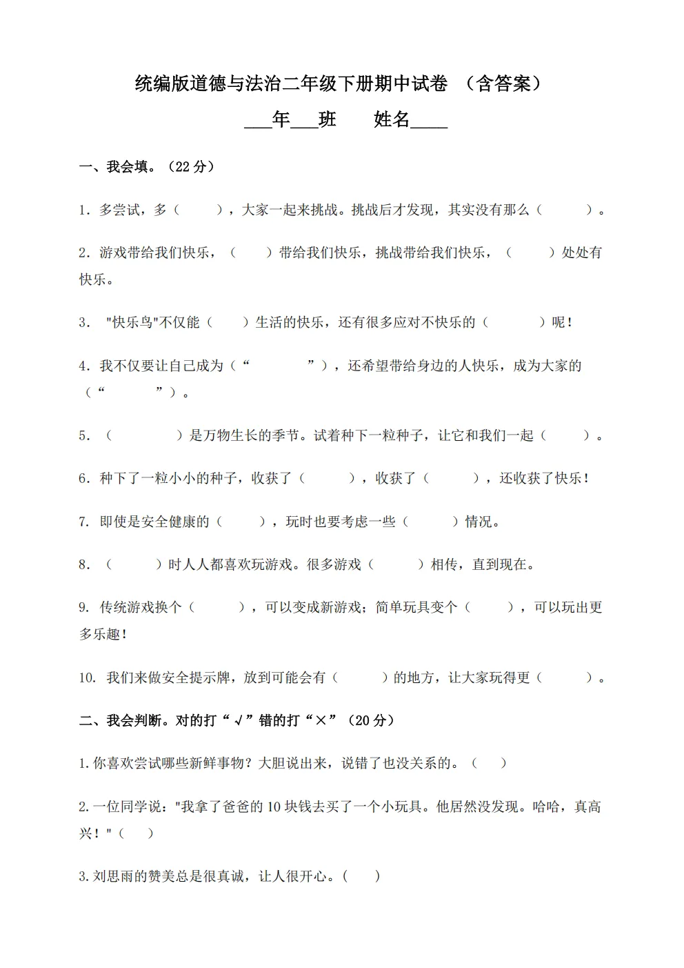 26春二年级下册人教部编版《道德与法治期中测试卷》共2套(附答案)高清可打印
