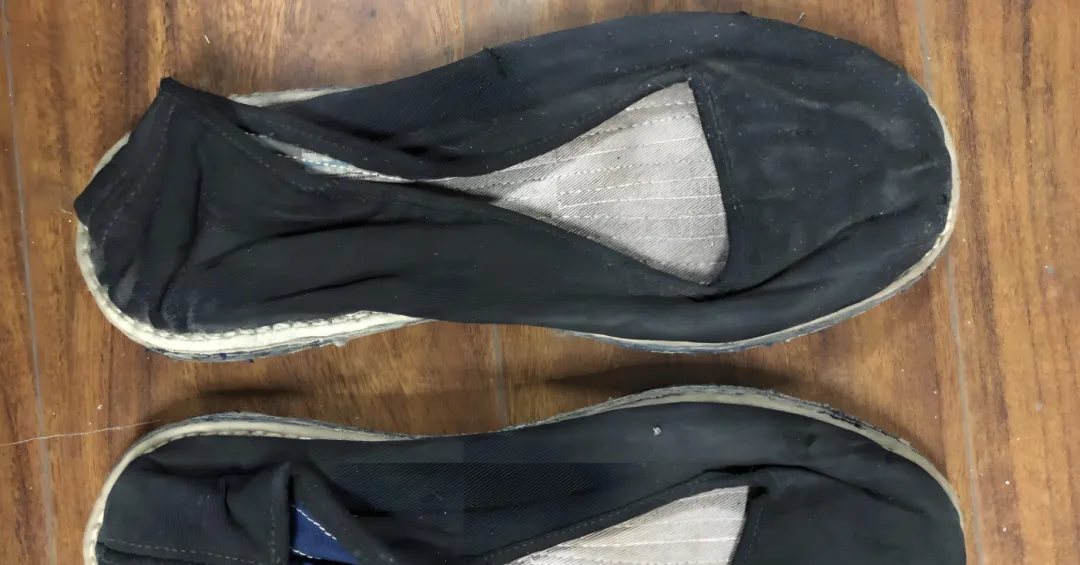 黑布的,鞋面都塌了,边上磨得发白,一看就穿了很多年,以前这种鞋不叫复古,就是日常,出门下地走亲戚全靠它,我奶奶做的布鞋,鞋底一层层纳出来的,硬是硬点但穿着踏实,你家以前有没有,我是记得特别清楚,晚上灯下纳鞋底的样子。