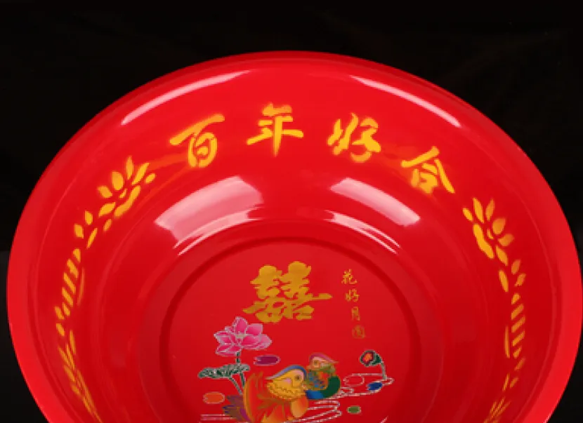 诶这个,大红的,颜色特别正,上面写着百年好合,还印着鸳鸯,一看就是结婚用的,以前陪嫁必备,盆暖壶毛巾,都是实打实要用的东西不是摆设,现在年轻人可能觉得俗,可那会儿红颜色就是过日子的底气。