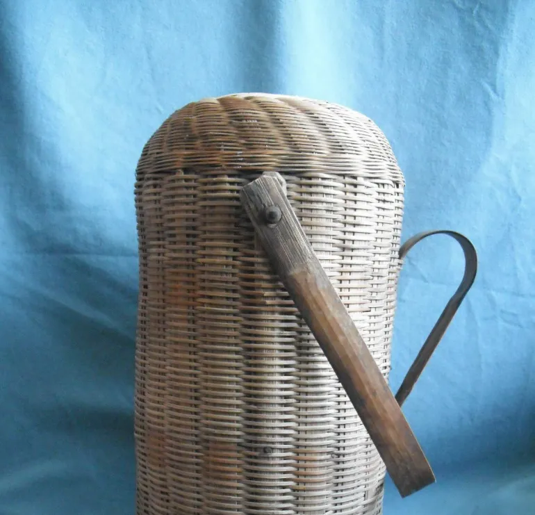 现在摆出来年轻人可能当装饰品看,以前它是真天天用,早晨灌满开水,谁喝谁倒,外头竹编的壳子摸着发涩,提手总有点磨手,有时候不小心摔一下,里面胆碎了,那一天都心疼,一只热水瓶能用好几年,瓶塞上拴根小绳怕丢了。