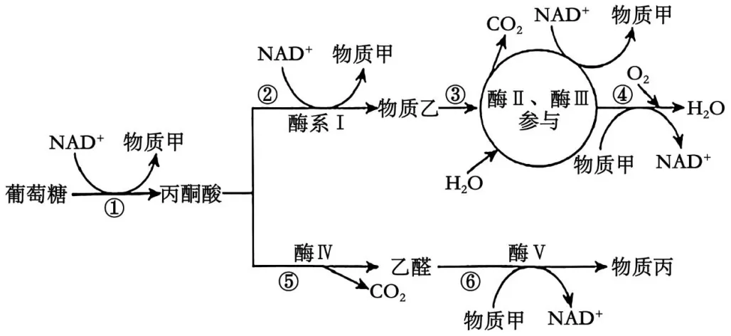 7.某植物具有一定的水淹耐性,但长时间水淹会导致根系细胞中酶Ⅱ和酶Ⅲ的活性显著降低,酶Ⅴ的活性显著增加。下图为该植物根系中不同途径的细胞呼吸过程(①②③④⑤⑥表示过程),下列叙述正确的是()
