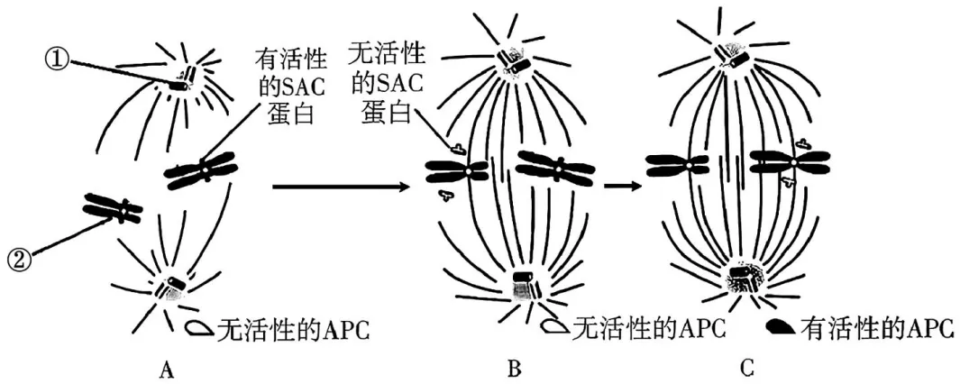 12.有丝分裂中染色体的正确分离需要细胞内的监控机制来保证,纺锤体组装检验点依赖SAC蛋白,它监控着纺锤丝与着丝粒之间的连接,APC为后期促进因子,如图所示。下列叙述正确的是()