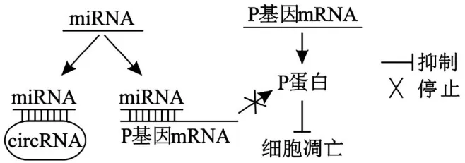 13.P基因是调节细胞凋亡的重要基因,通过RNA干扰可调控P基因表达进而影响细胞凋亡,其调控机制如下图所示。图中miRNA可与mRNA靶向结合并使其降解,而circRNA可靶向结合miRNA使其不能与mRNA结合。下列叙述正确的是()