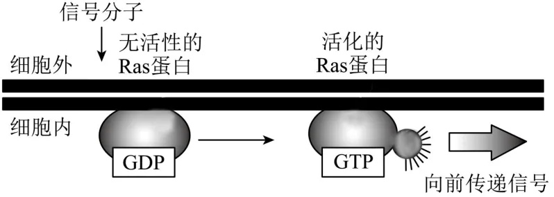 15.GTP(鸟苷三磷酸)与ATP结构相似,结构简式为G-P~P~P,可与Ras蛋白结合为Ras蛋白-GTP。在一定条件下,Ras蛋白具有弱的GTP酶活性,可将与之结合的GTP水解成GDP,成为失活型的Ras蛋白-GDP。下图表示当细胞外存在信号分子时,细胞膜上的Ras蛋白释放出自身的GDP并结合GTP,实现由失活态向活化态的转变,将胞外信号向胞内传递的过程。下列叙述正确的是()