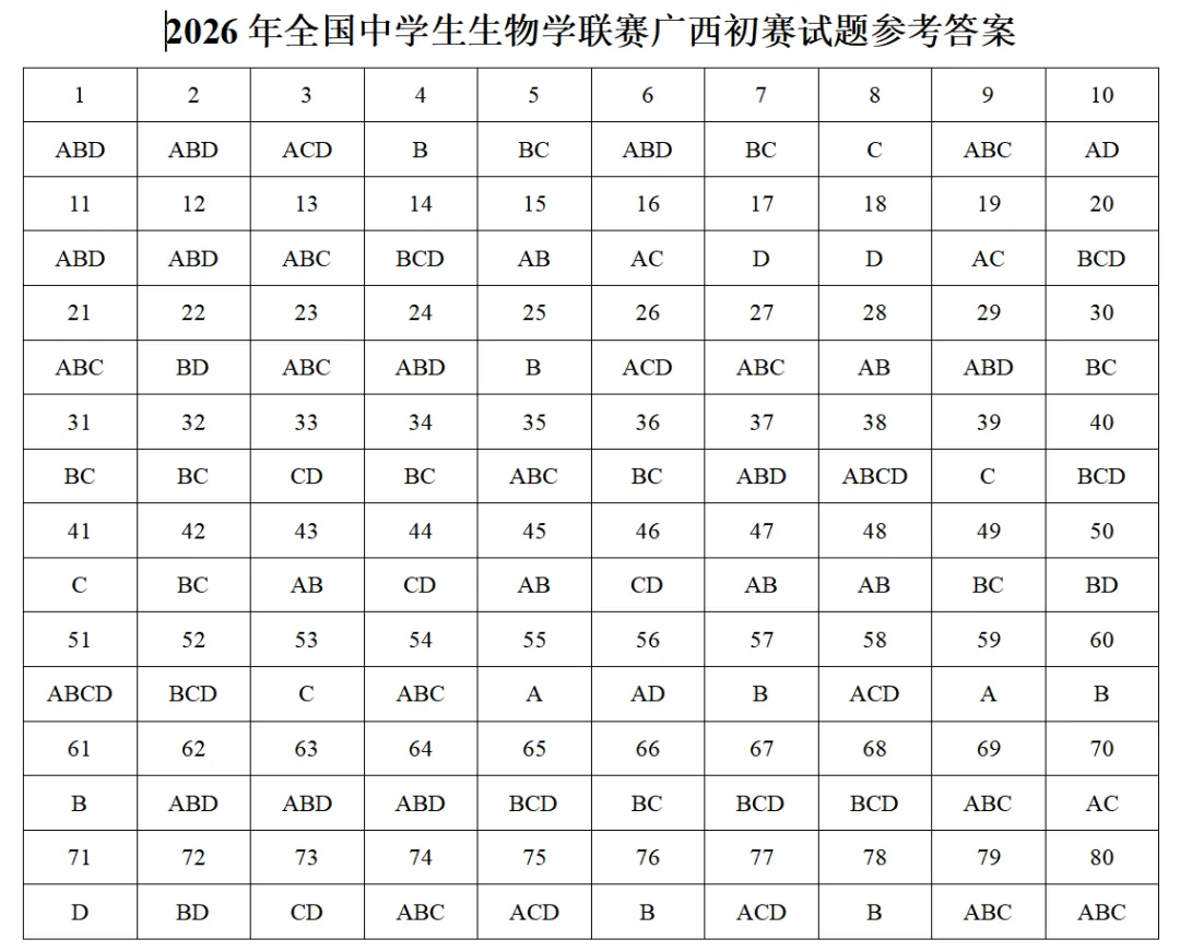 2026年全国中学生生物学联赛广西初赛试题参考答案