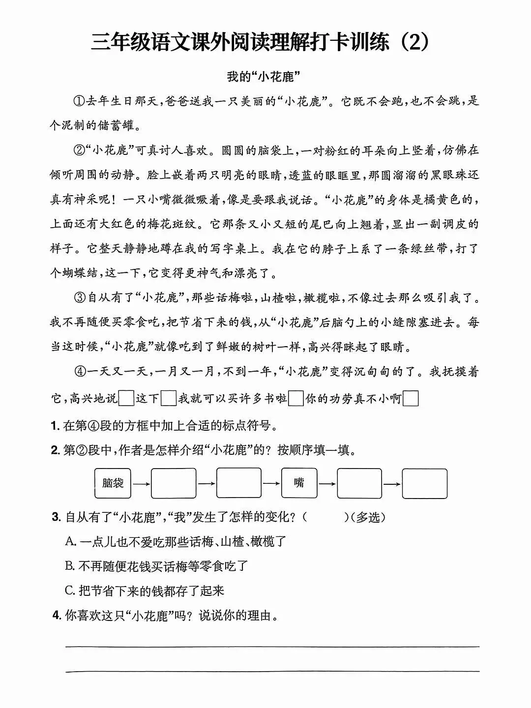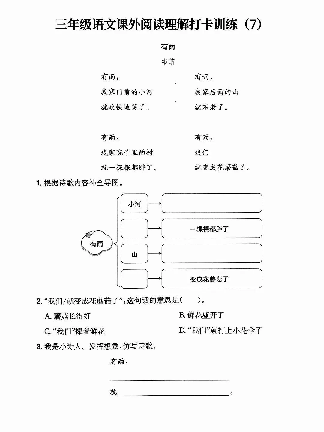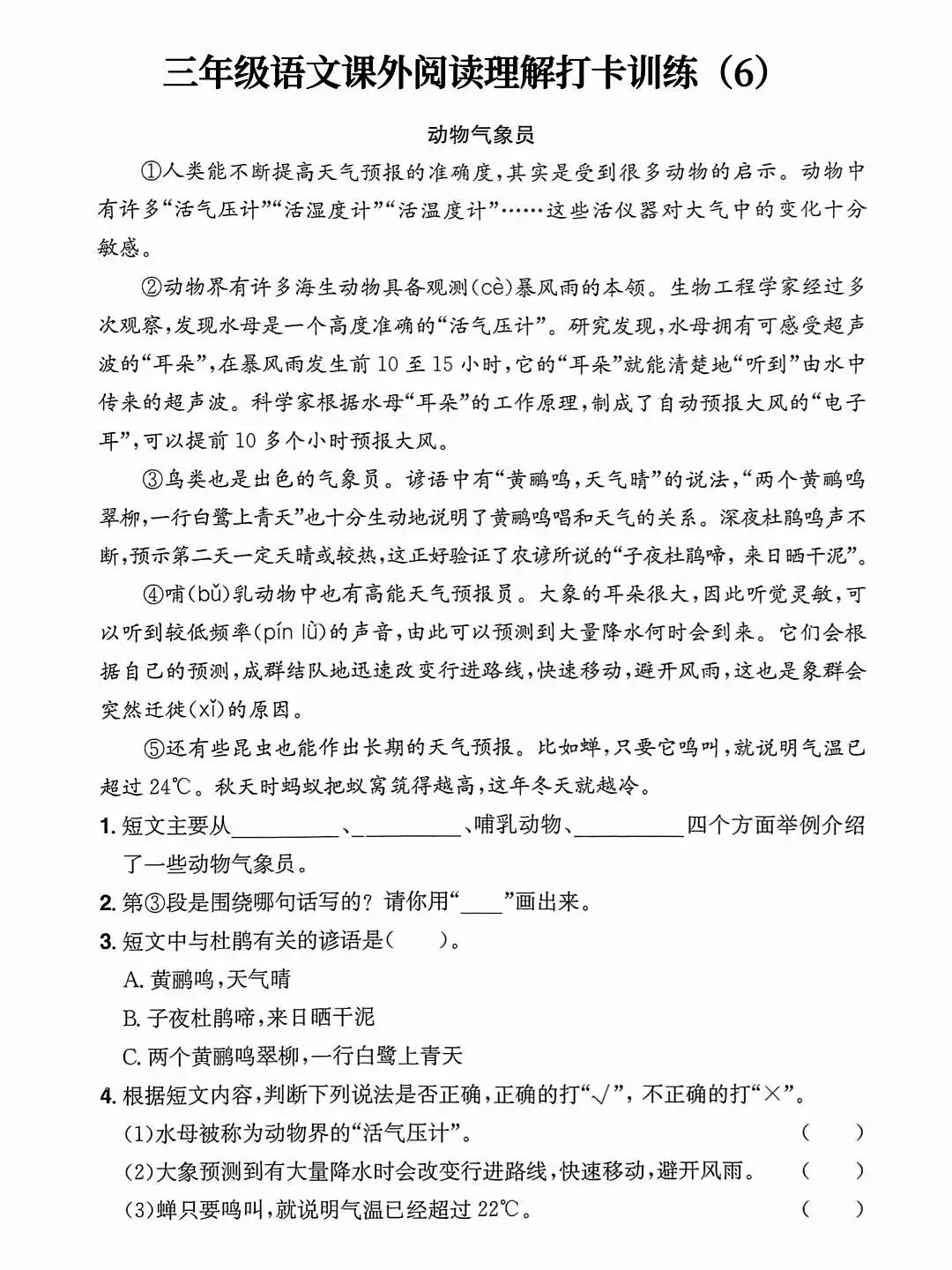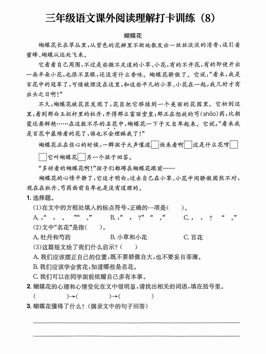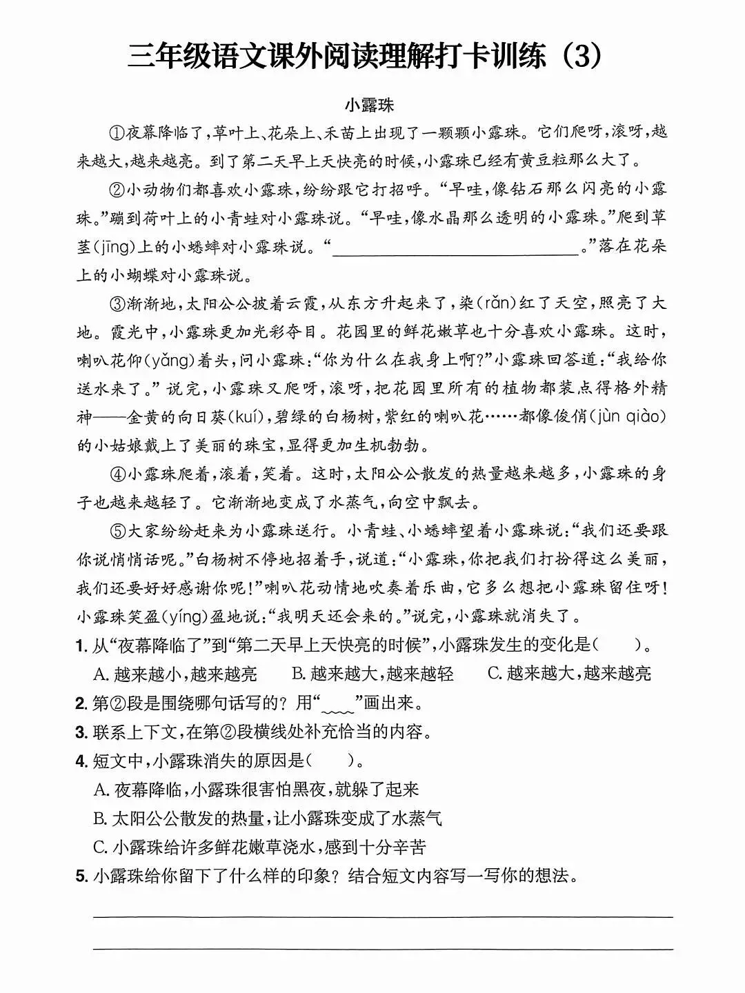 三年级下册语文课外阅读训练,有答案高清电子版可打印