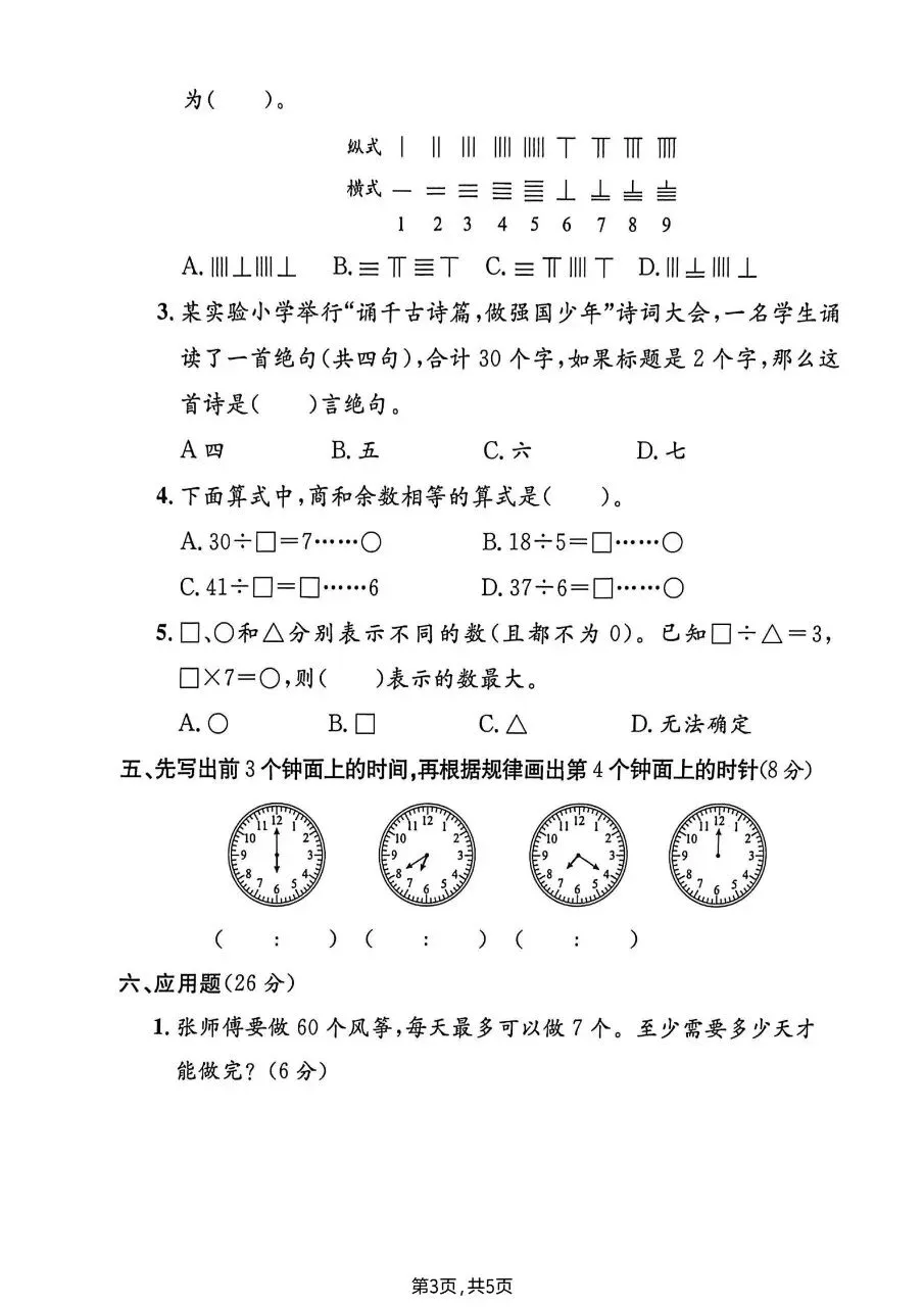 熟练掌握乘除混合运算(遵循先乘除后加减)、有余数除法竖式计算,牢记“余数小于除数”;能解决括号最大能填几、错中求解(看错被除数求正确商)、商余相等算式判断等题型;掌握逆运算求未知数(如求被除数、减数、加数),熟练万以内数的大小比较。