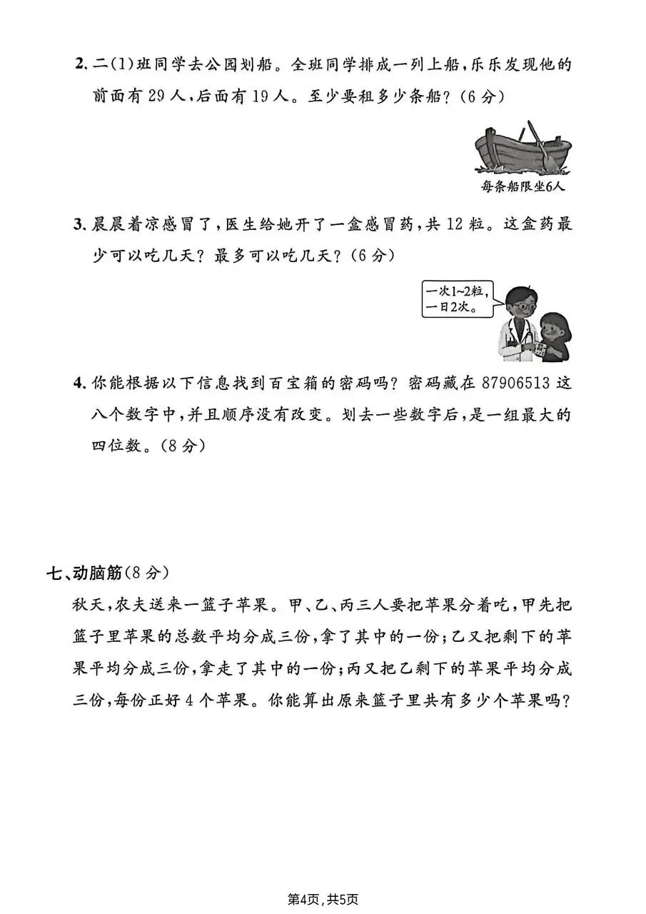 掌握“进一法”(如做风筝、租船)、“去尾法”的实际应用;解决分糖果、分苹果等平均分问题;结合生活场景(吃药天数、租船、密码推理),培养逻辑推理与数学应用能力,理解数学与生活的联系。