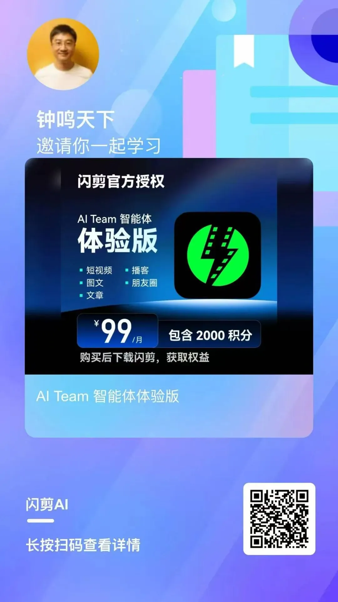 “闪剪智能体”可以私信小满哥,扫码下图,一个月有效期,可以制作 20 多条短视频