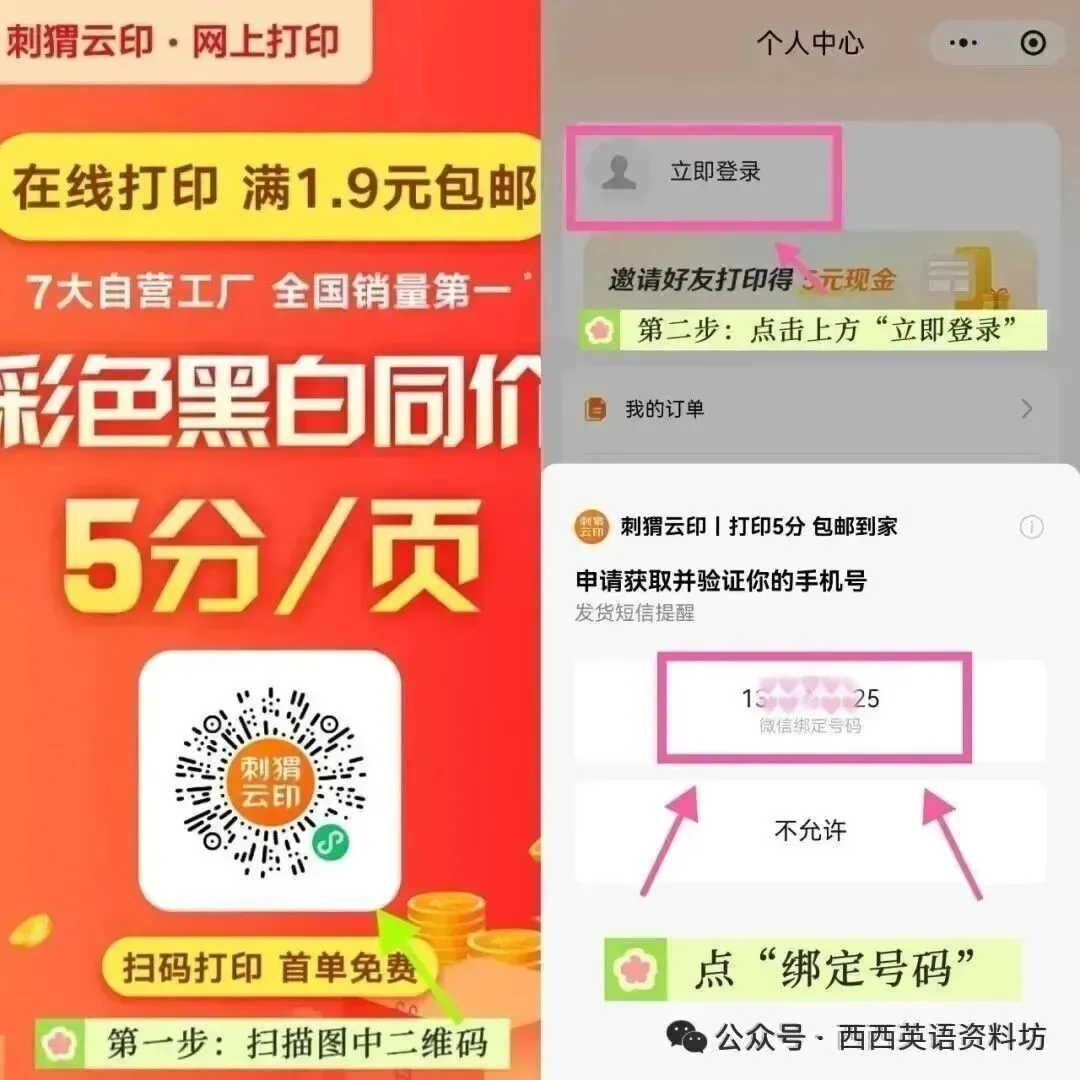 本公众号粉丝福利来啦!🔔✅黑白彩色都是5分/页(首单免费)✅ 刺猬云印现在满1.9元即可包邮啦!✅ 满2.9元可免费升级顺丰快递✅ 20点前下单,当天火速发货!👇第一步: 扫下图二维码;第二步:点正上方“立即登录”;第三步:绑定手机号码,即可一键注册下单打印哦!