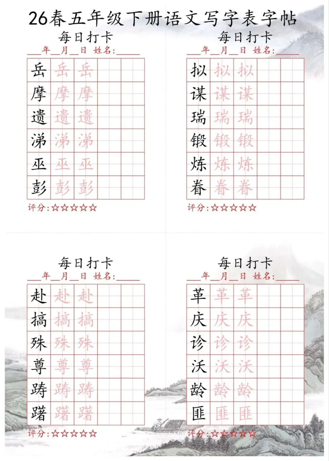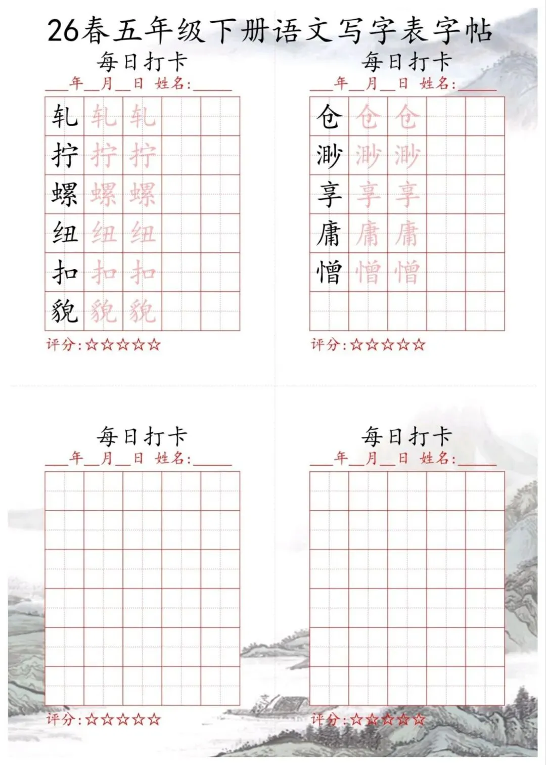 26春五年级下册语文写字表字帖每日打卡,电子版可下载打印