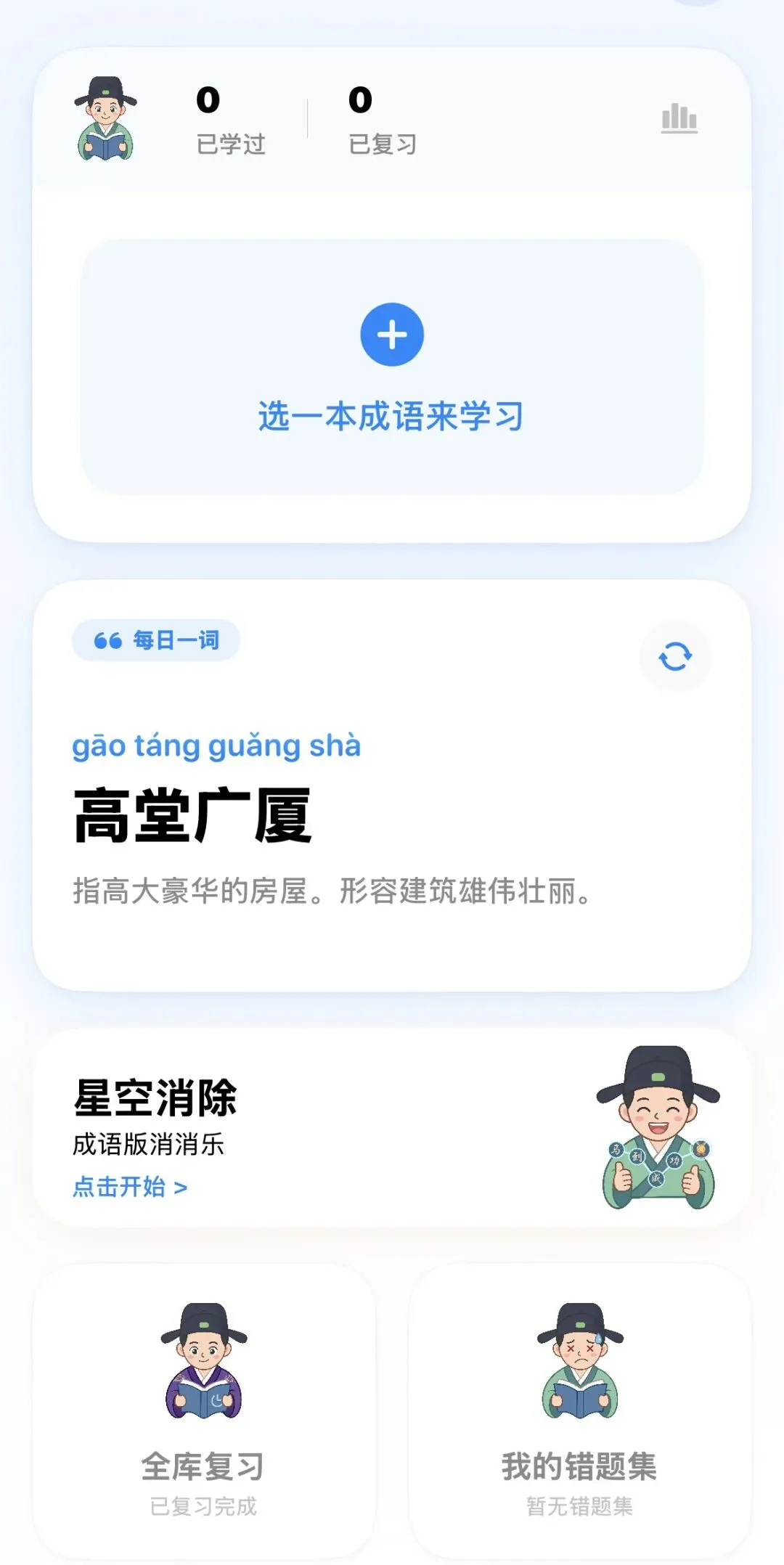 为了解决成语记忆不牢固的问题,APP搭载了基于间隔记忆算法的复习机制,贴合人类记忆规律设计复习流程。用户完成新成语学习后,系统会自动规划复习时间,在记忆即将淡化时推送复习任务,通过反复巩固强化记忆效果,大幅提升学习效率。同时,应用会完整记录用户的学习与复习情况,生成个人学习数据,用户可随时查看未掌握成语,针对性开展查漏补缺,不用再花费时间自行整理复习清单,让成语复习更有章法、更具针对性。