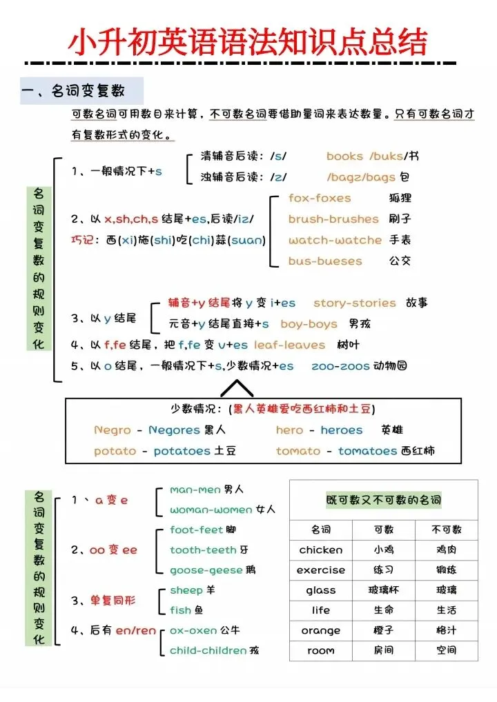 今日份分享小升初英语语法知识点总结(完整电子版可打印)!这份资料已经整理成可打印版本,方便孩子随时翻看学习,建议家长先收藏,再转发给身边有需要的家庭,一起帮助孩子高效学习~