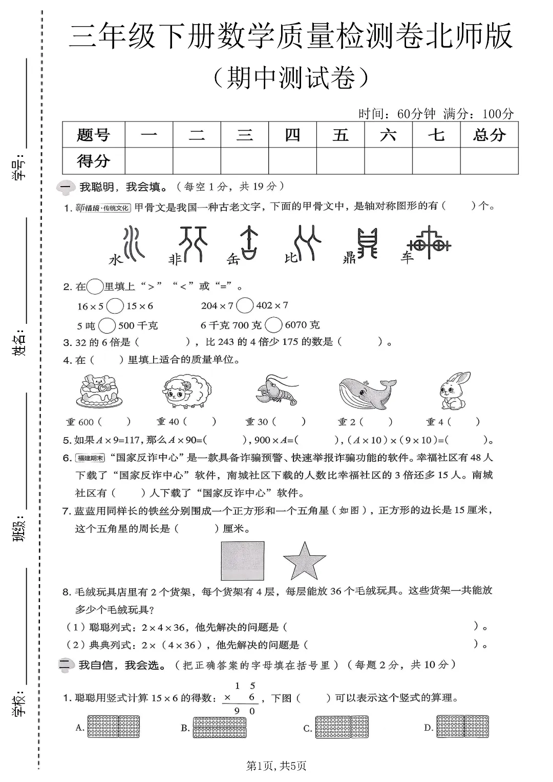 🌟今日给大家分享的:2026年春新三年级下册北师大版数学《期中考试测试卷+1-4单元测试卷》共7套附答案解析‖电子版可打印