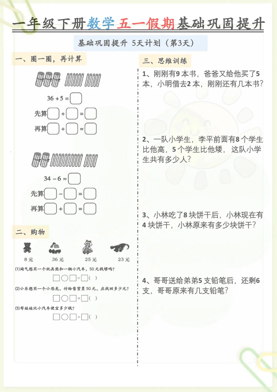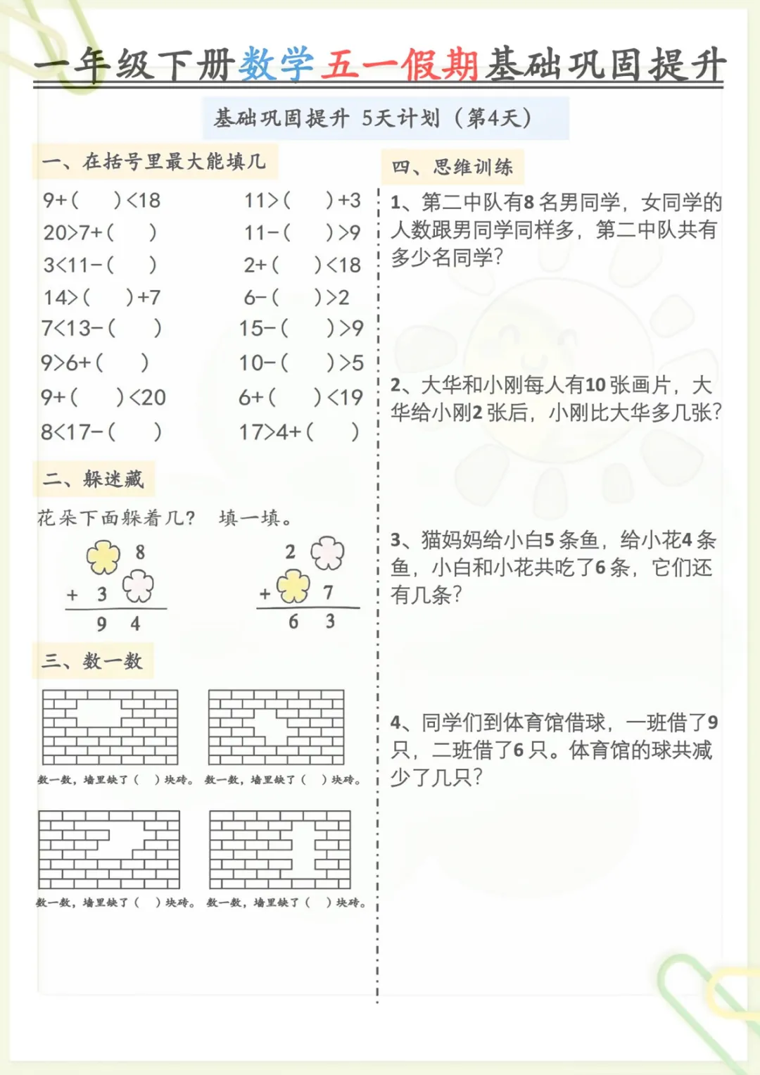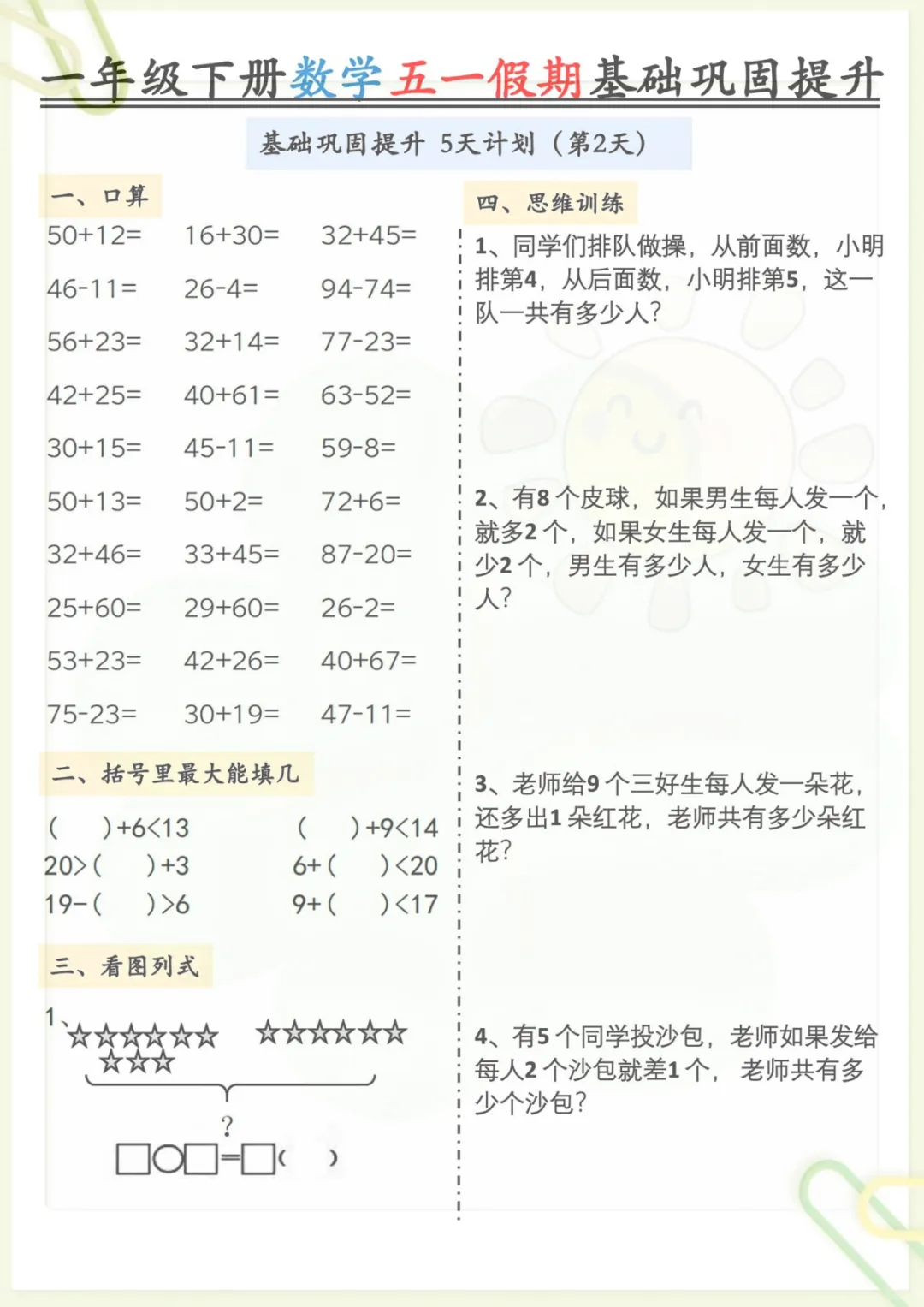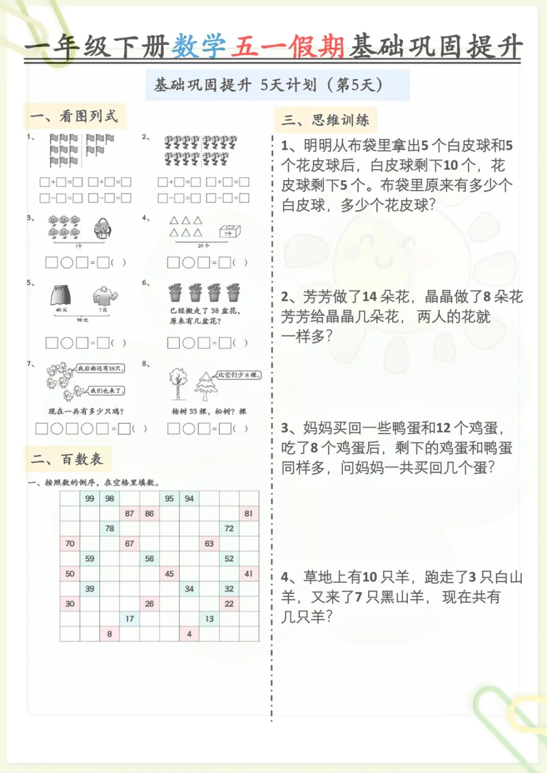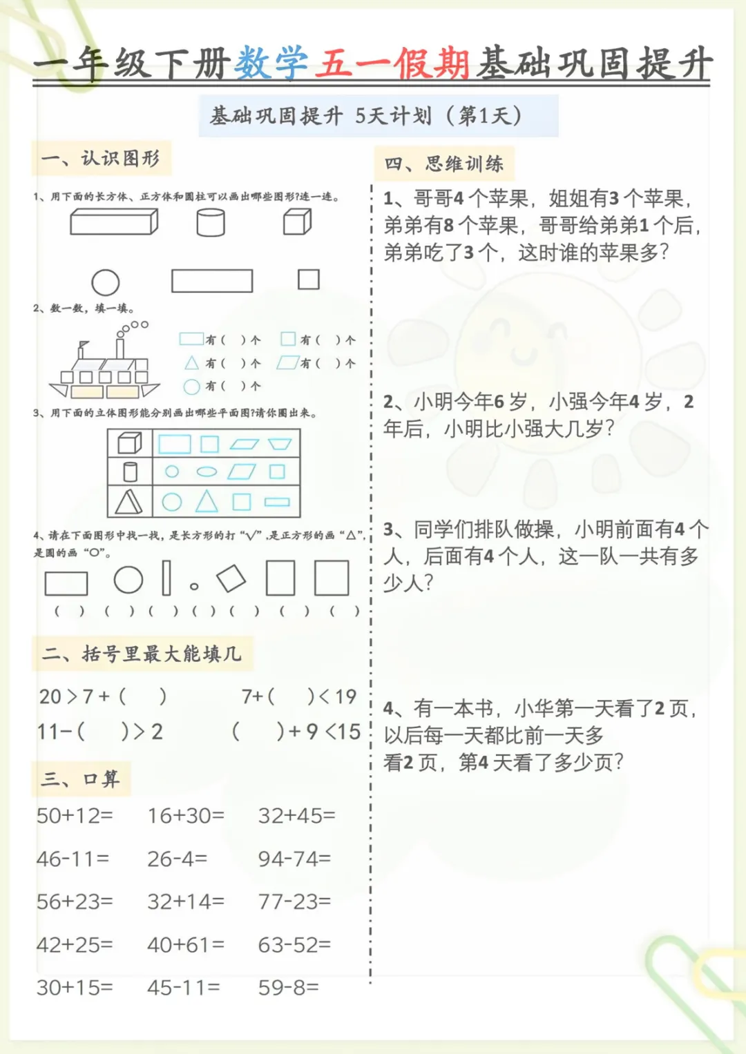 一年级下册数学《五一作业》,共5页,电子版可下载可打印,这份练习资料结合一年级下册数学学习内容,涵盖多个核心知识点与专项训练内容,适合孩子在假期里进行同步巩固与查漏补缺,帮助进一步夯实基础、提升计算与应用能力。需要的家长可以及时下载打印出来,让孩子趁着五一假期练一练。