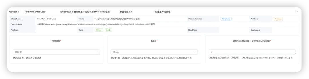 用途: 通过 DNS 外带或 Sleep 延时检测目标是否存在 TongWeb EJB 反序列化漏洞。建议优先使用该 Gadget 进行探测。