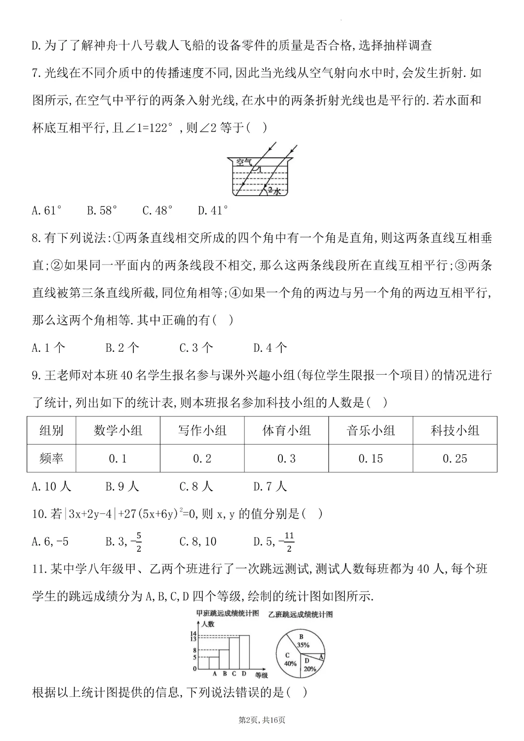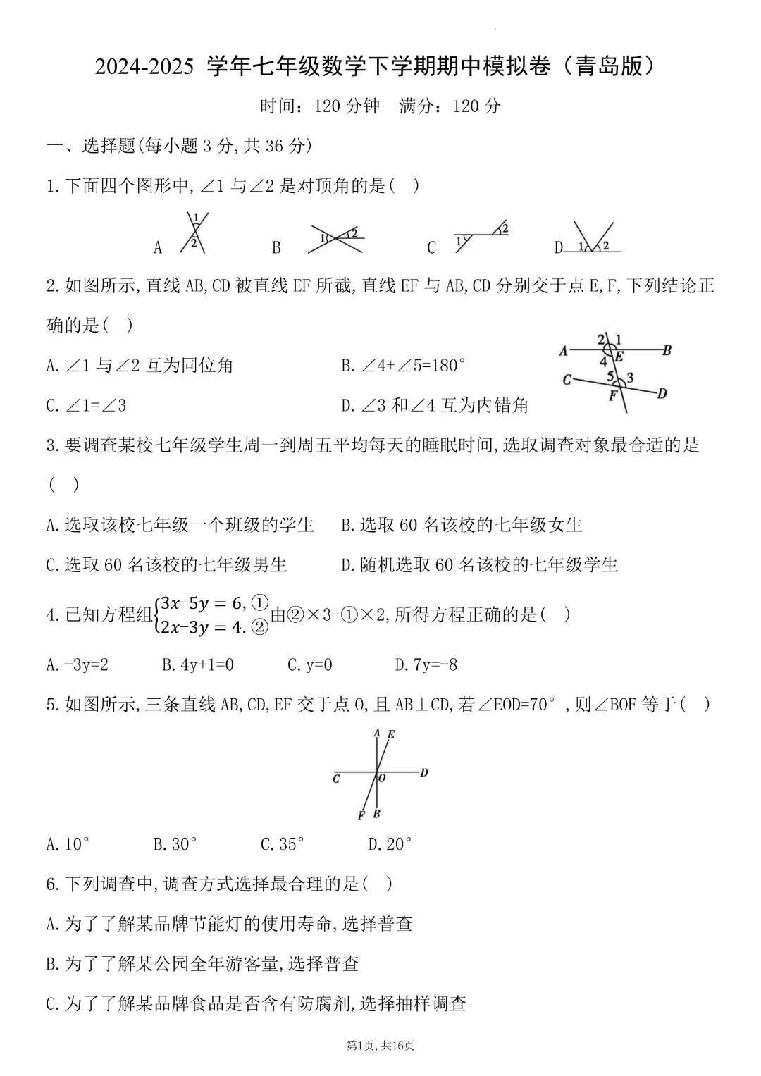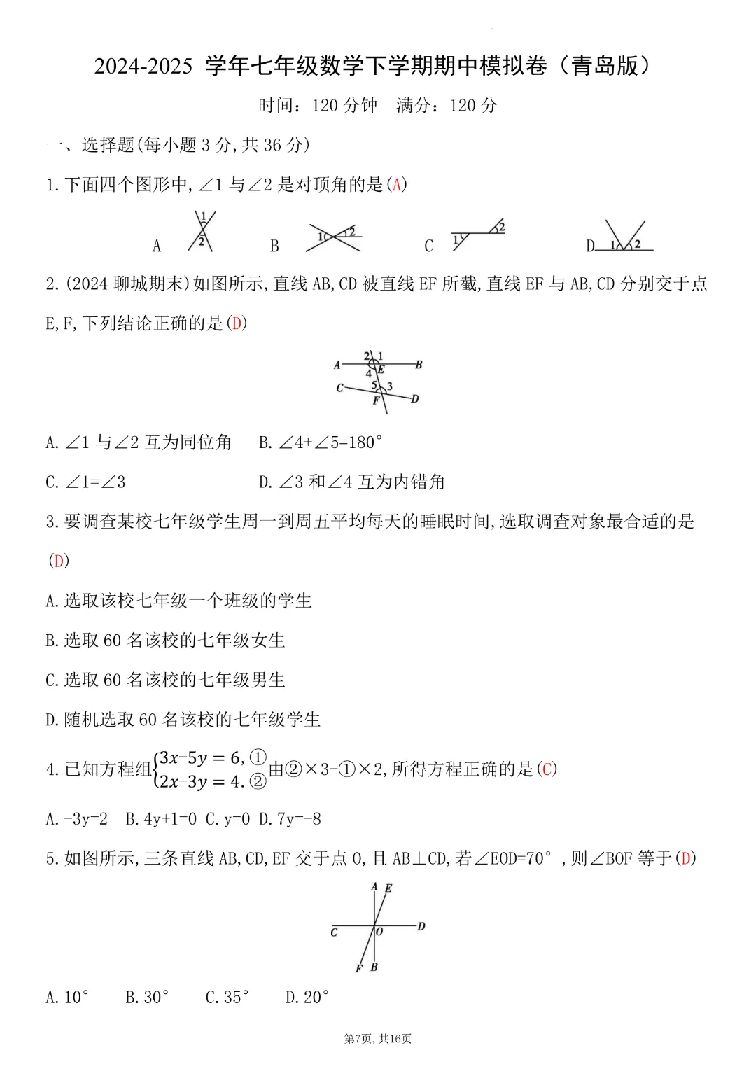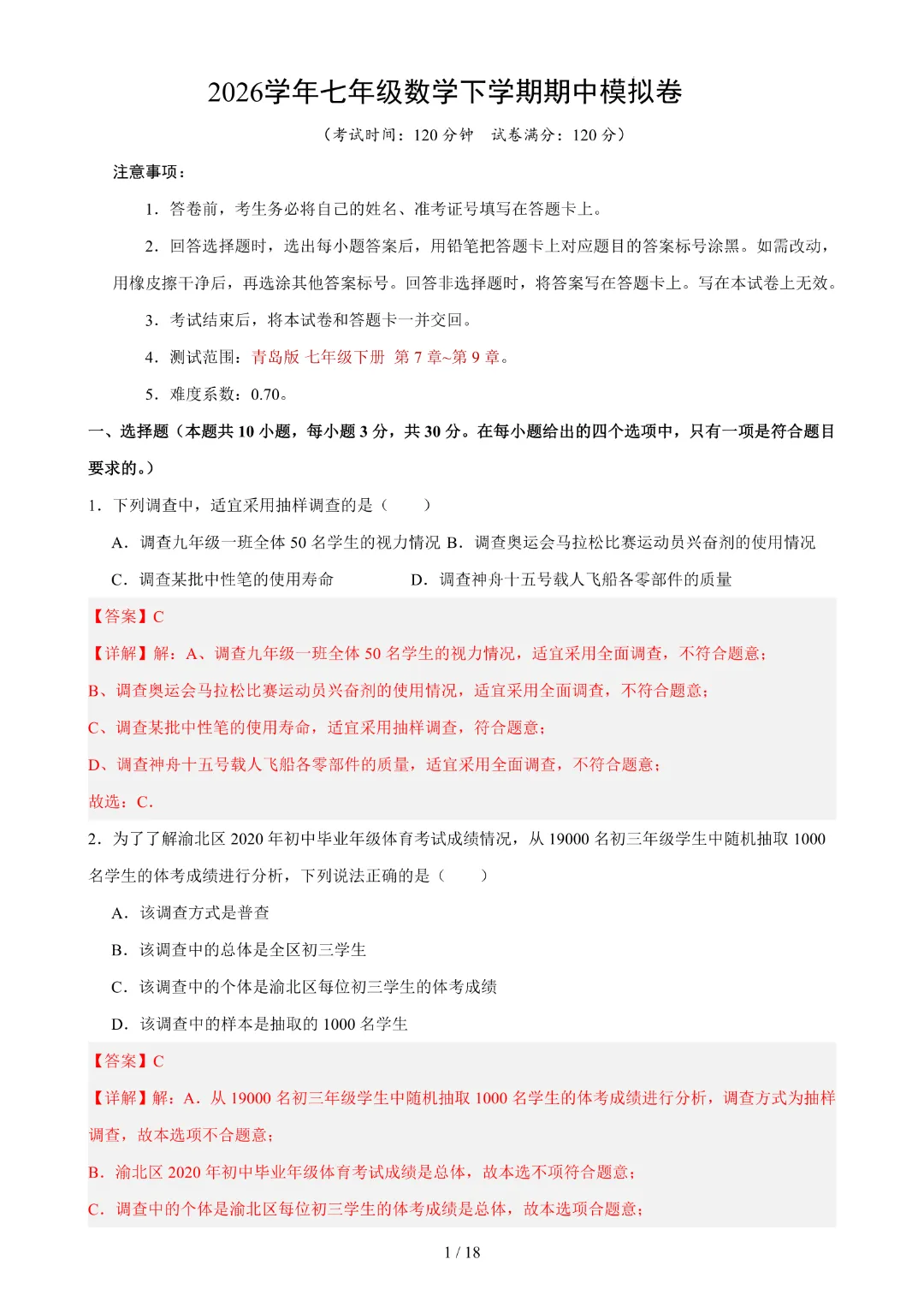 【青岛版】26年七年下册数学《期中模拟测试卷 共2套附答》完整电子版可打印