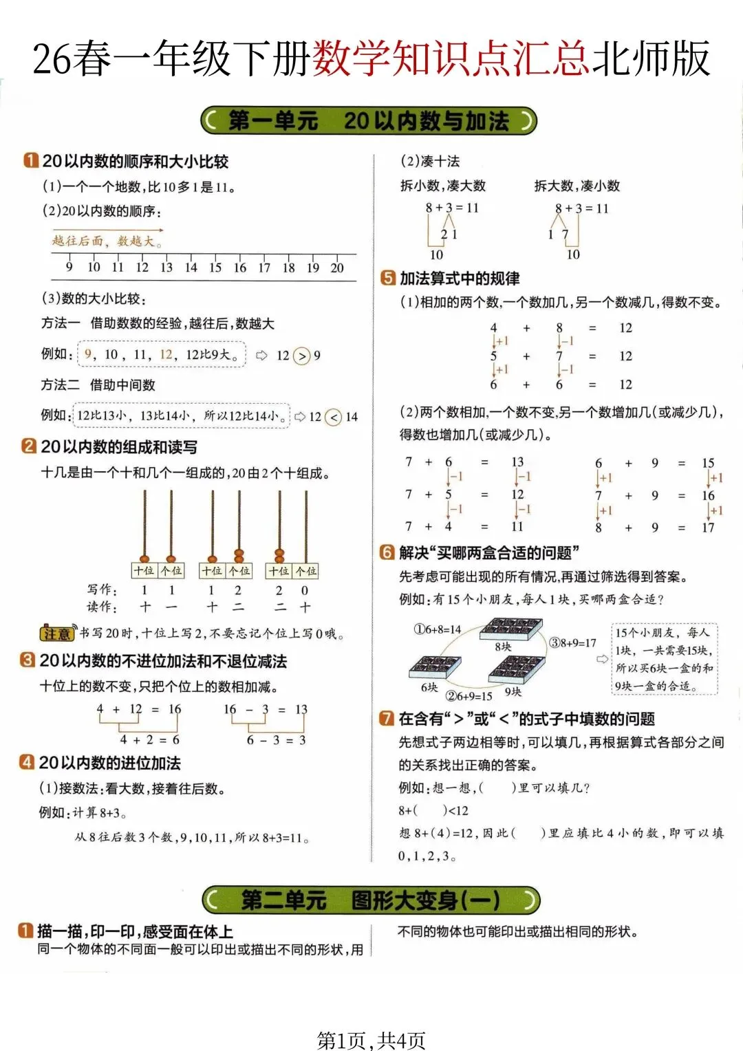 26年春新版一年级下册数学北师大版全册知识点汇总,完整版含答案,可打印