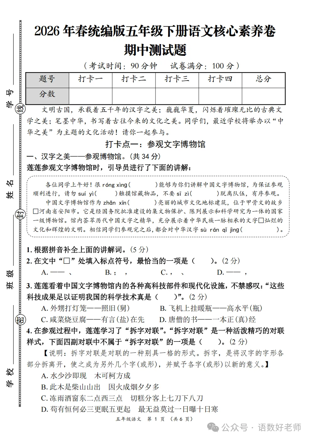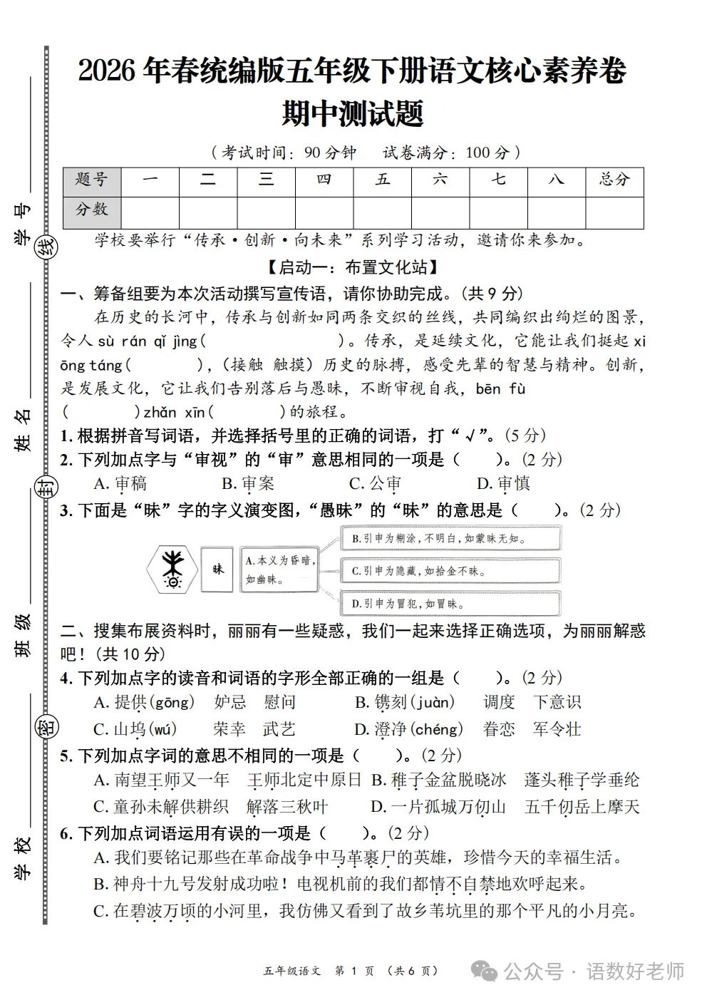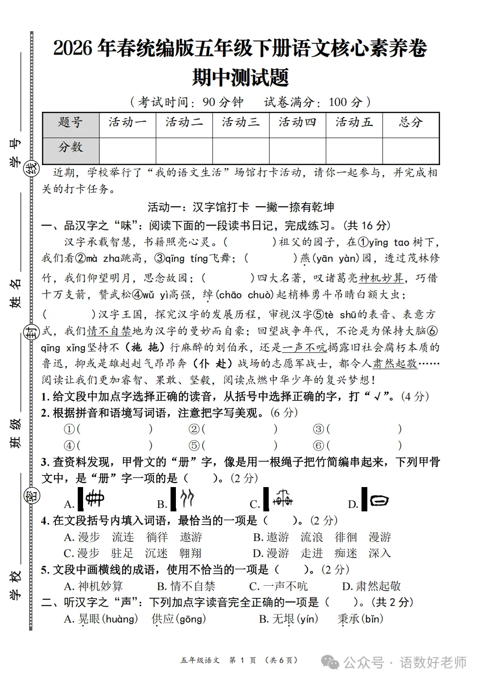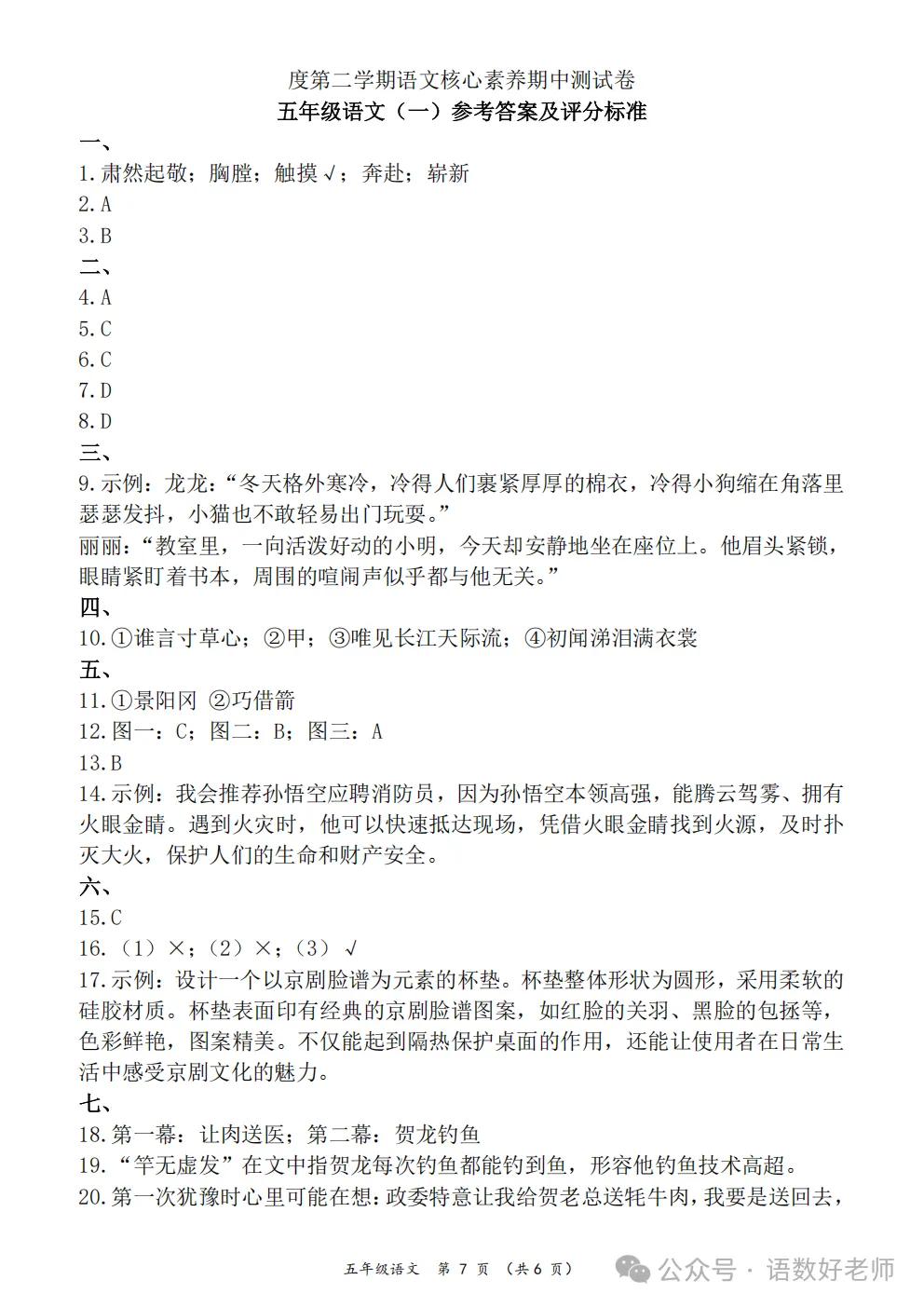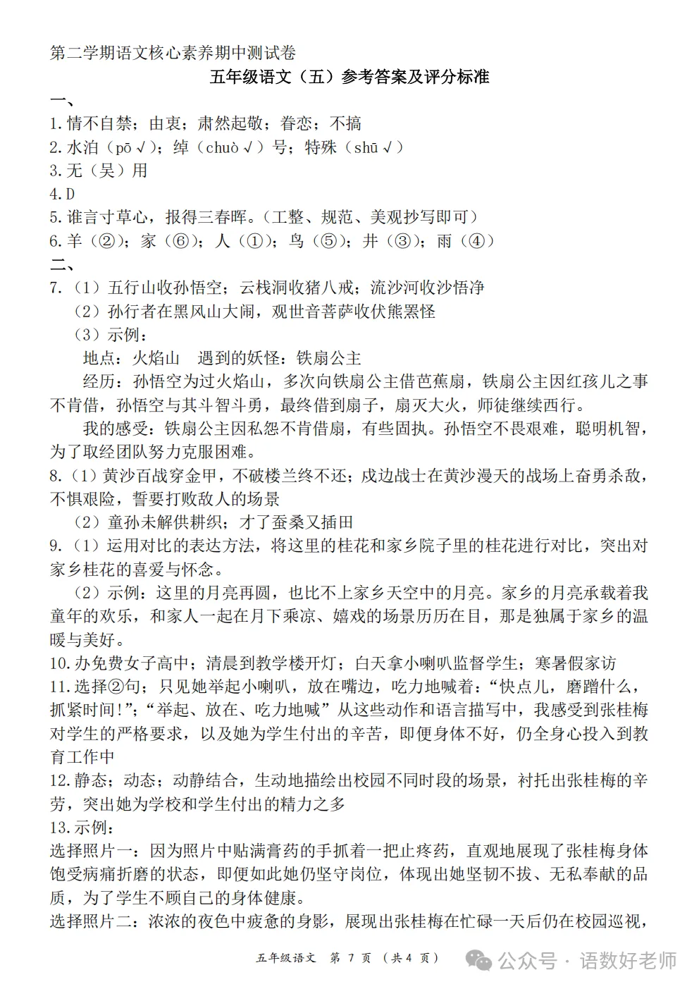 五年级下册语文《期中真题测试卷》附有答案可免费下载语数电子版试卷