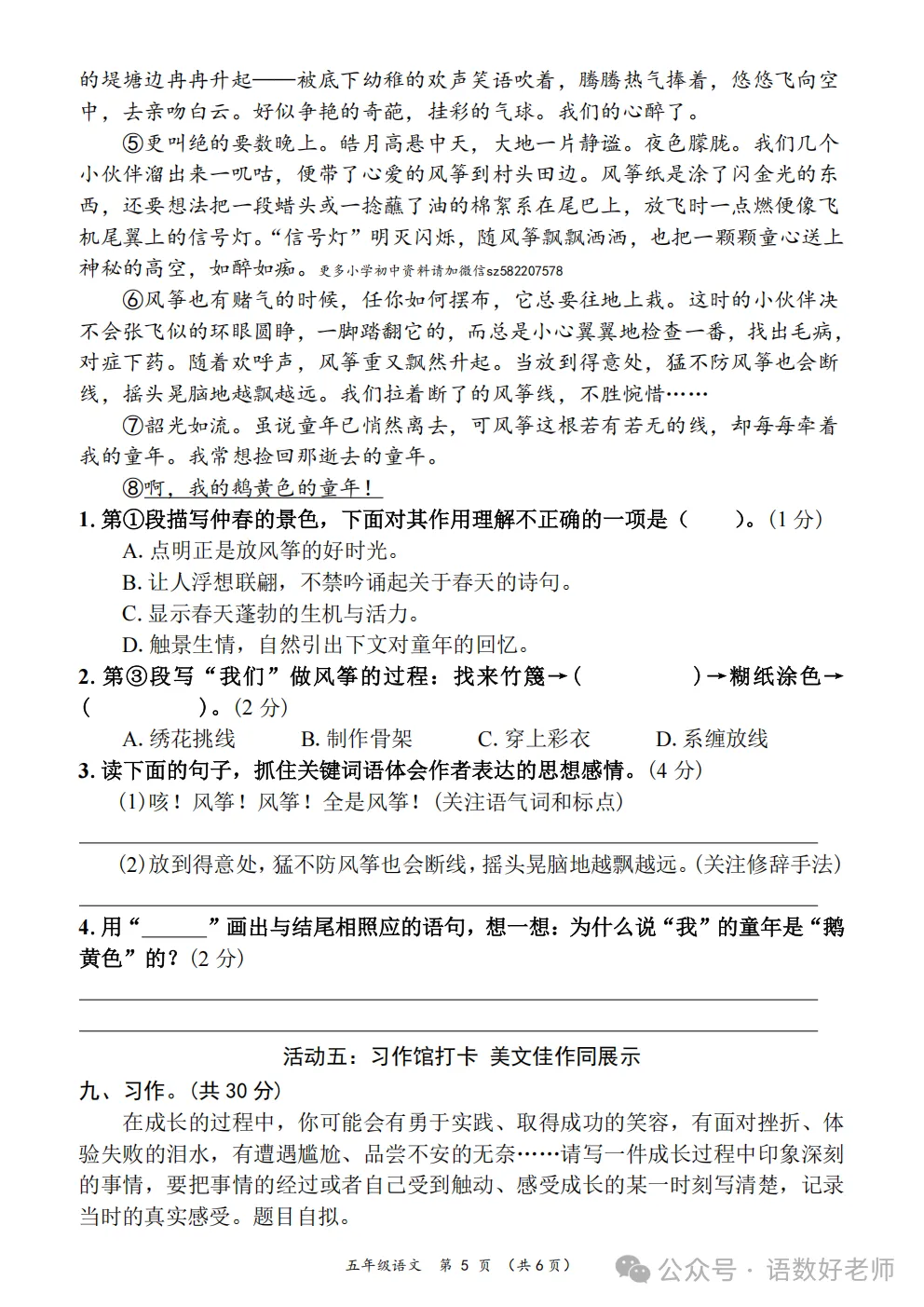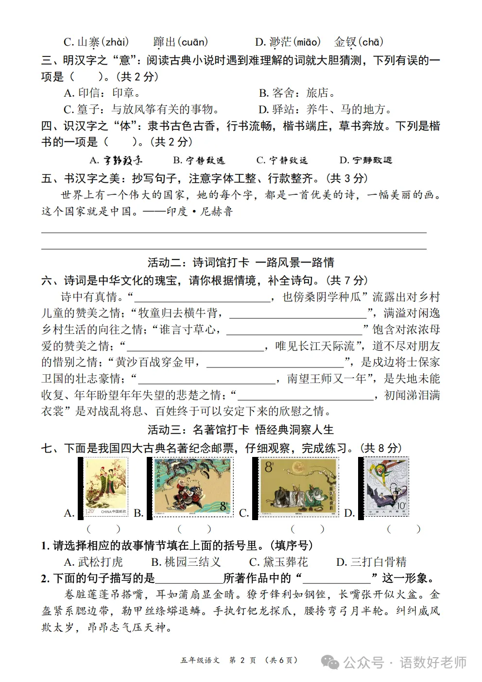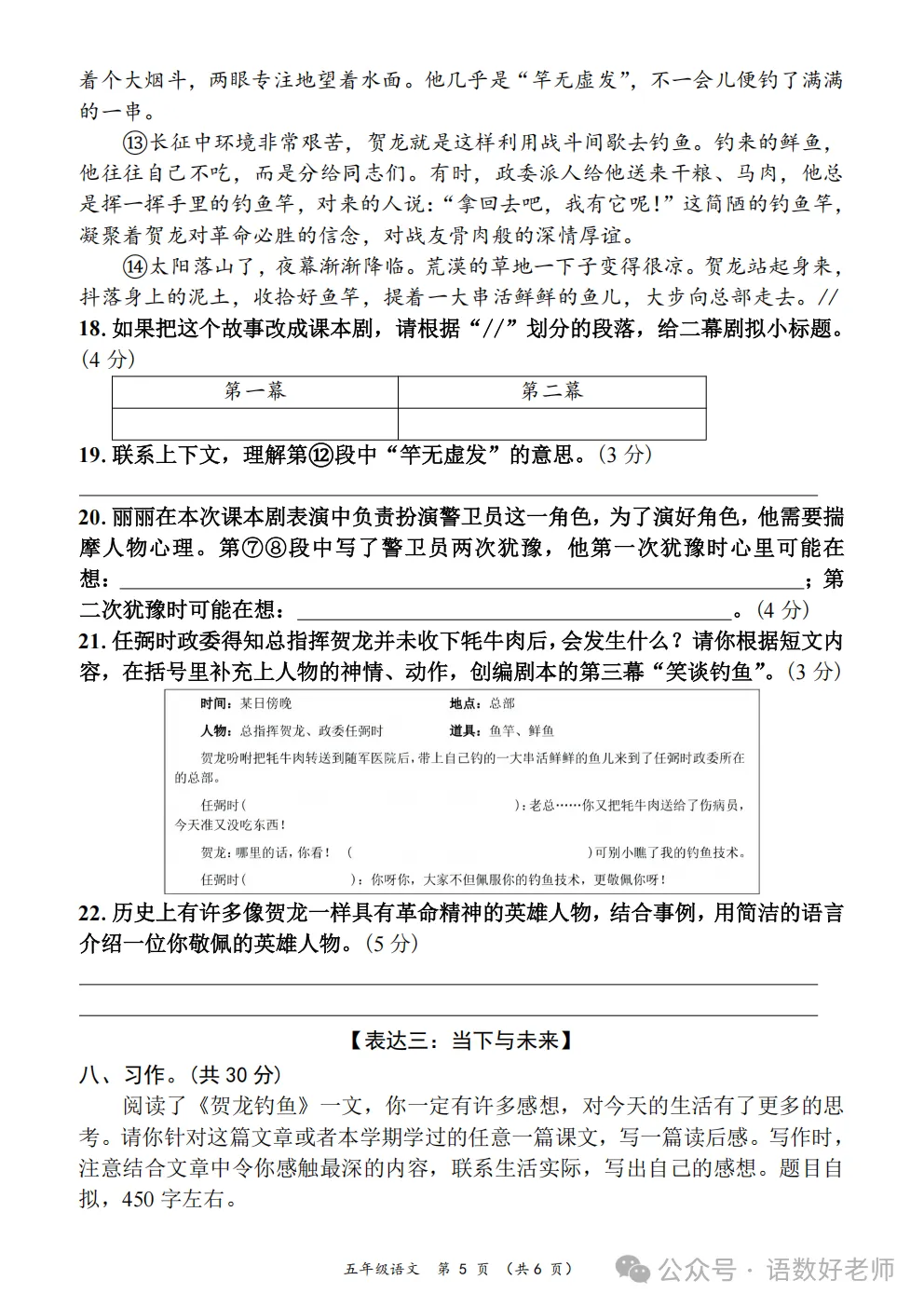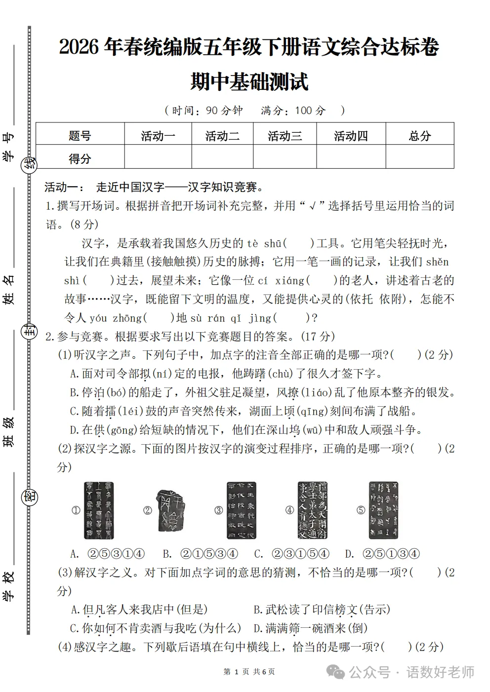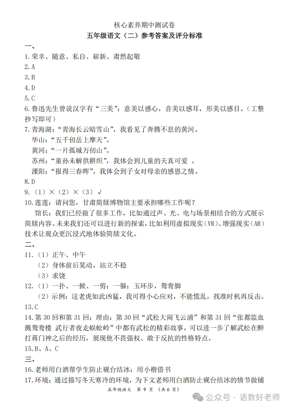 五年级下册语文《期中真题测试卷》附有答案可免费下载语数电子版试卷