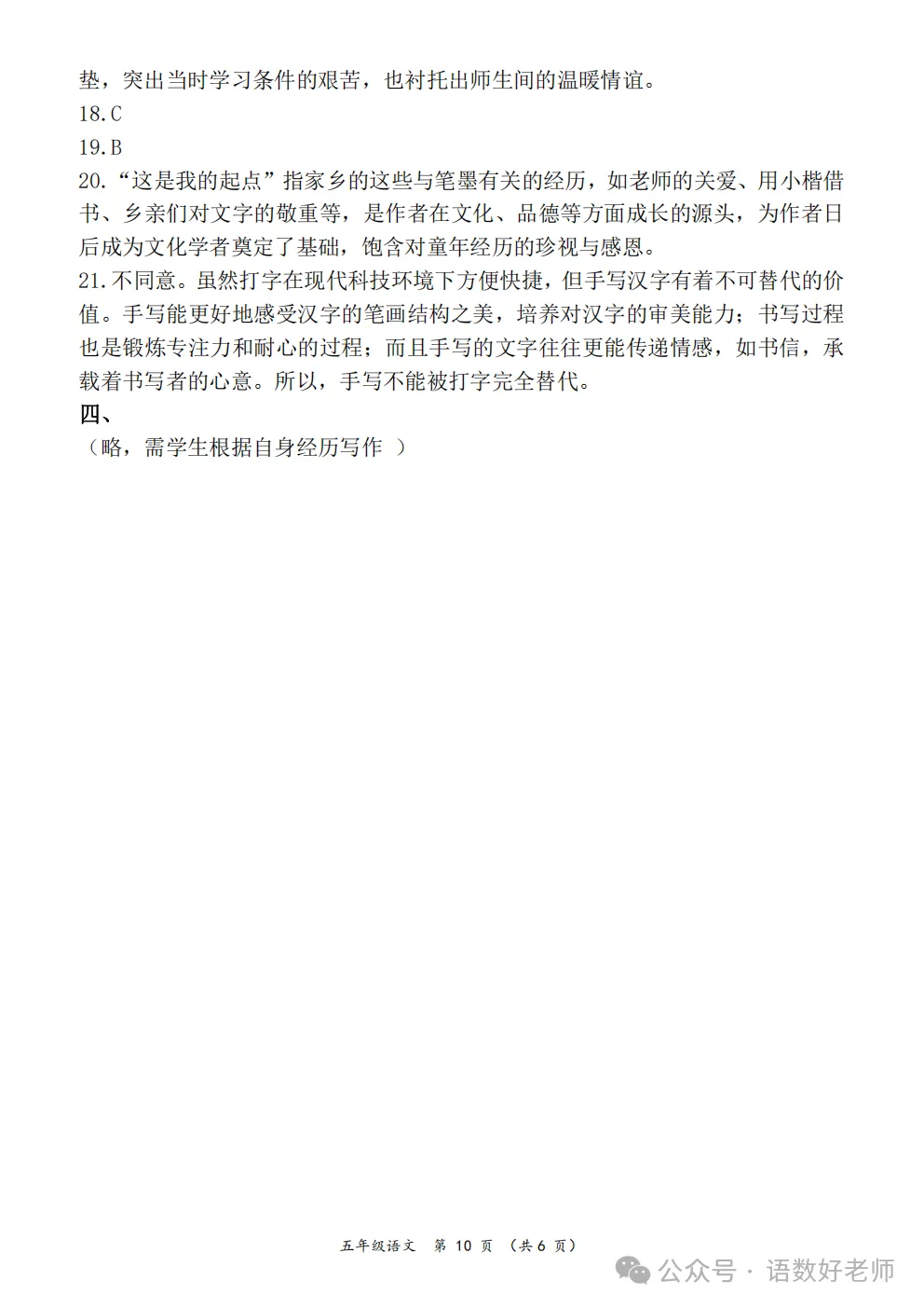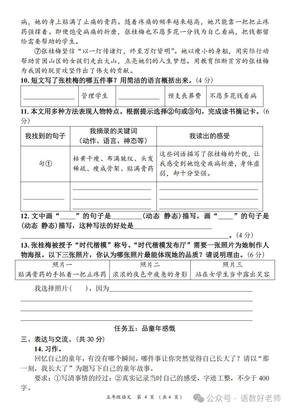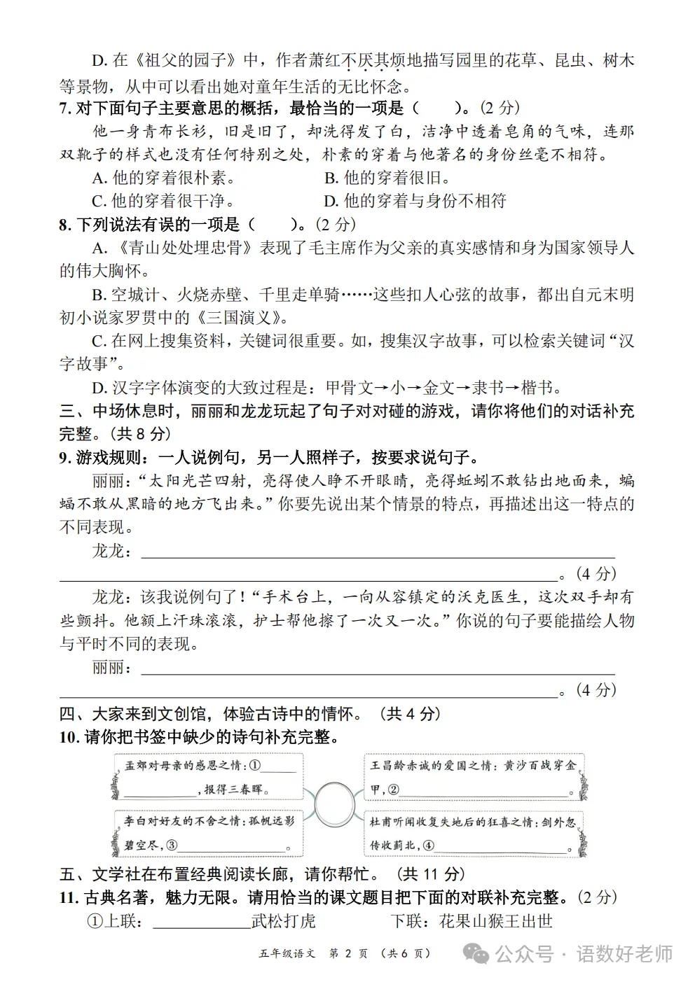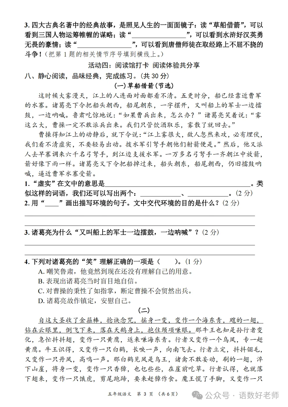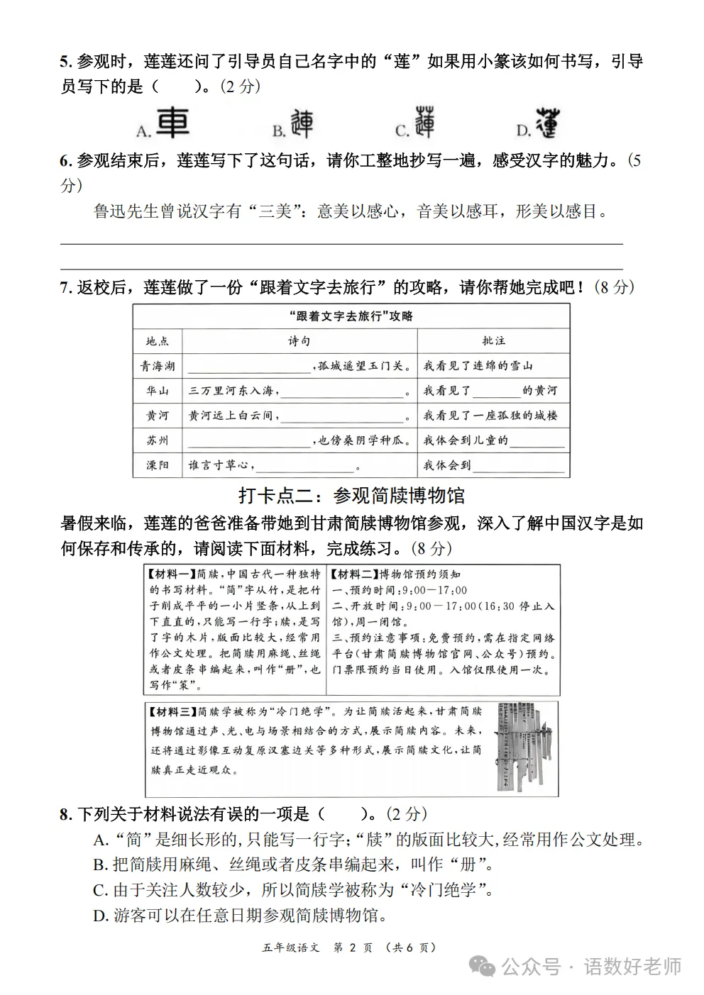 五年级下册语文《期中真题测试卷》附有答案可免费下载语数电子版试卷
