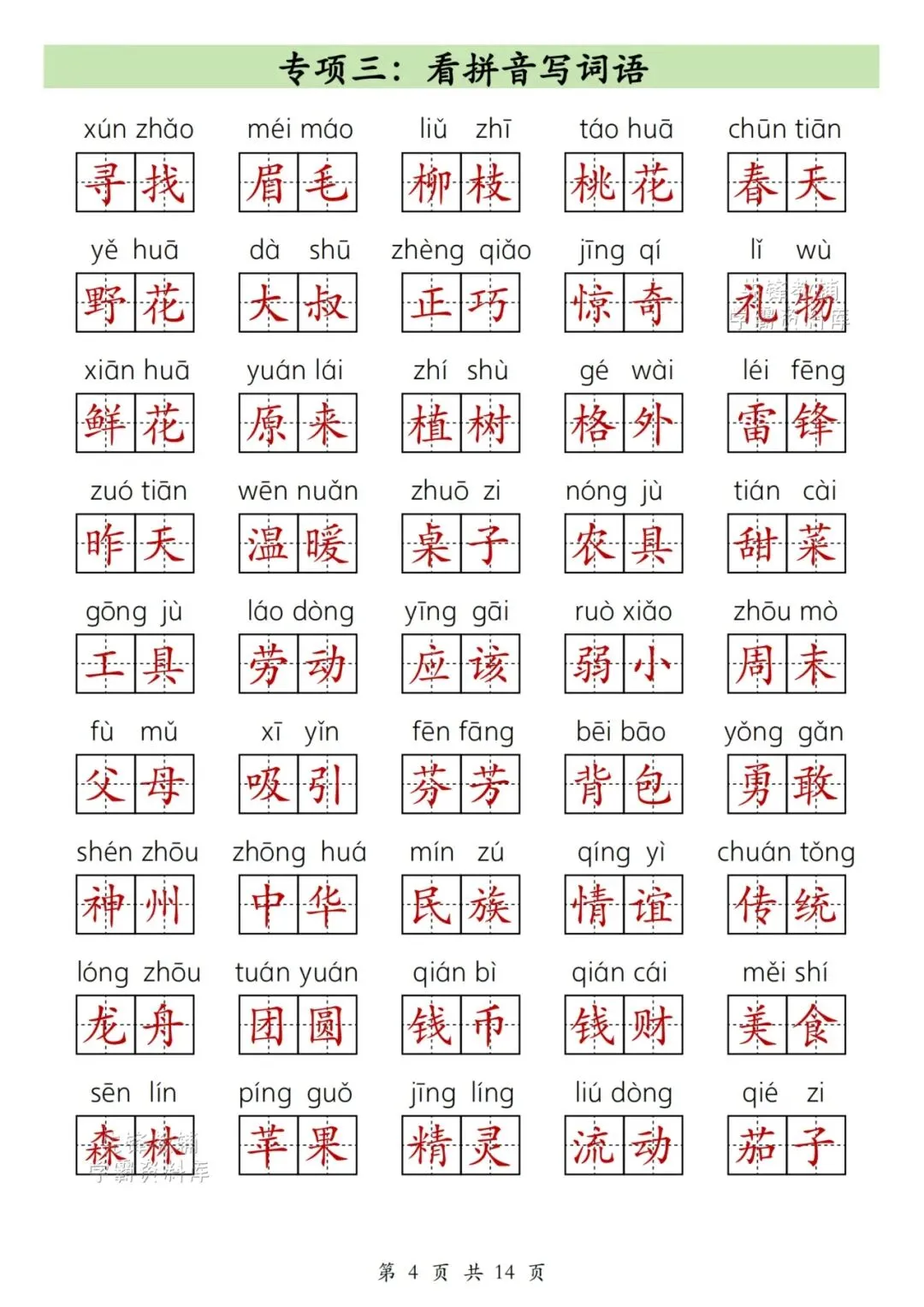 📚🔥26年新版二年级语文下册语文期中复习八大专项训练电子版可打印。这份合集涵盖生字积累、词语积累、看拼音写词语、句子仿写、课文回顾、按课文内容填空、阅读理解、看图写话八大核心模块,从基础积累到实战运用,层层递进、全面覆盖,彻底解决孩子“基础不牢、阅读失分、写话无措”的痛点,是期中复习不可或缺的“提分利器”!