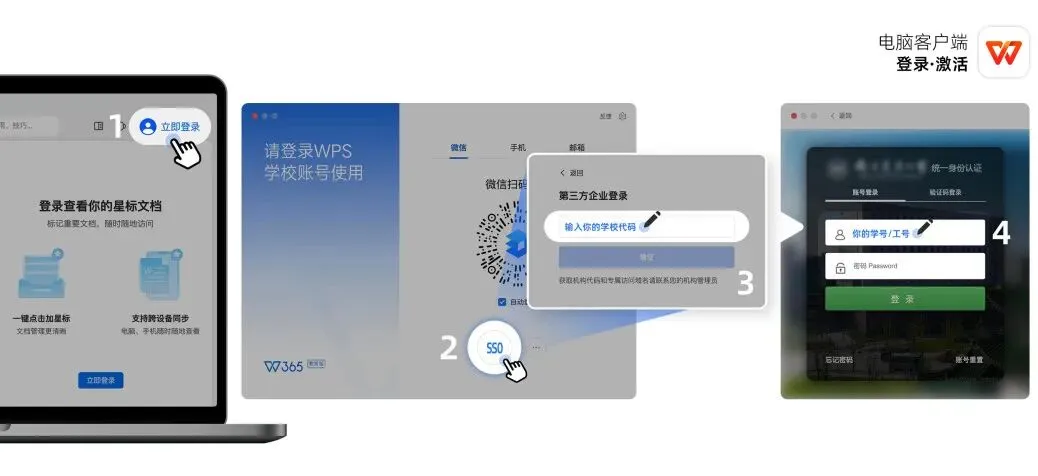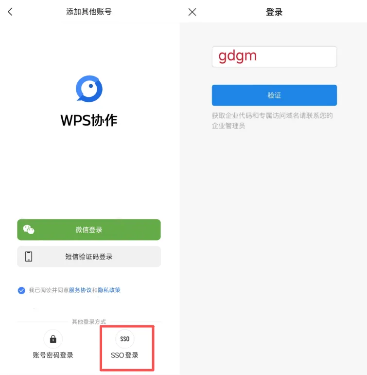 打开【WPS365教育版】或【WPS协作】登录,连接校园网点击右上角登录,选择SSO方式,输入学校名称或者代码【gdgm】,使用学工号和密码登录即可。