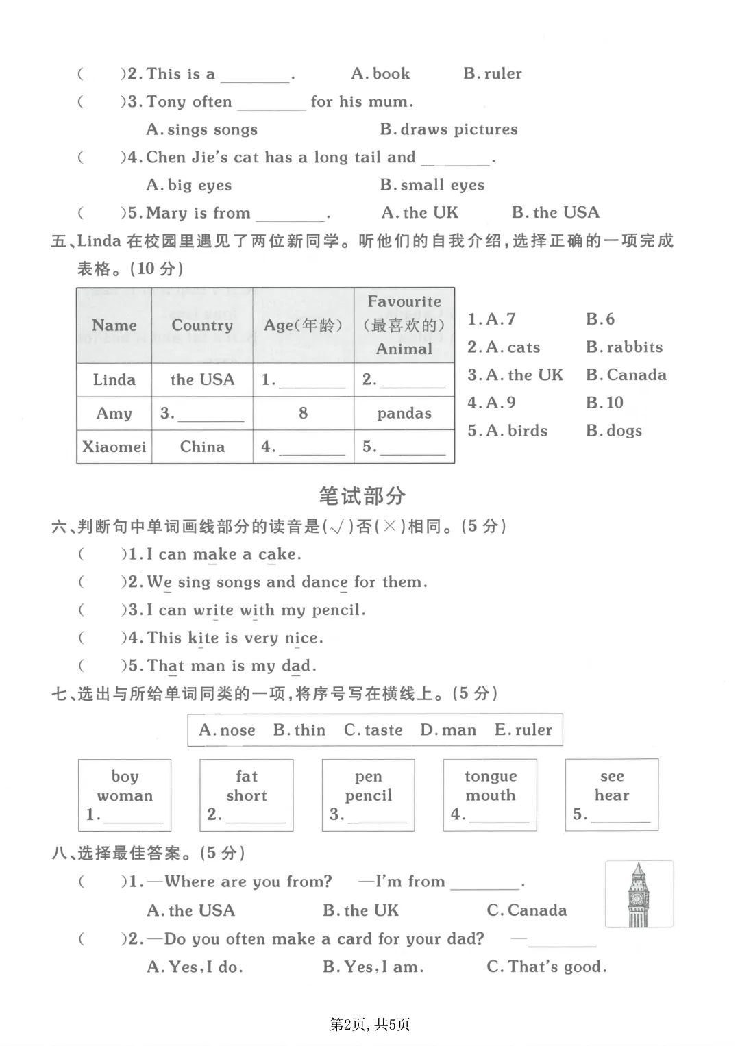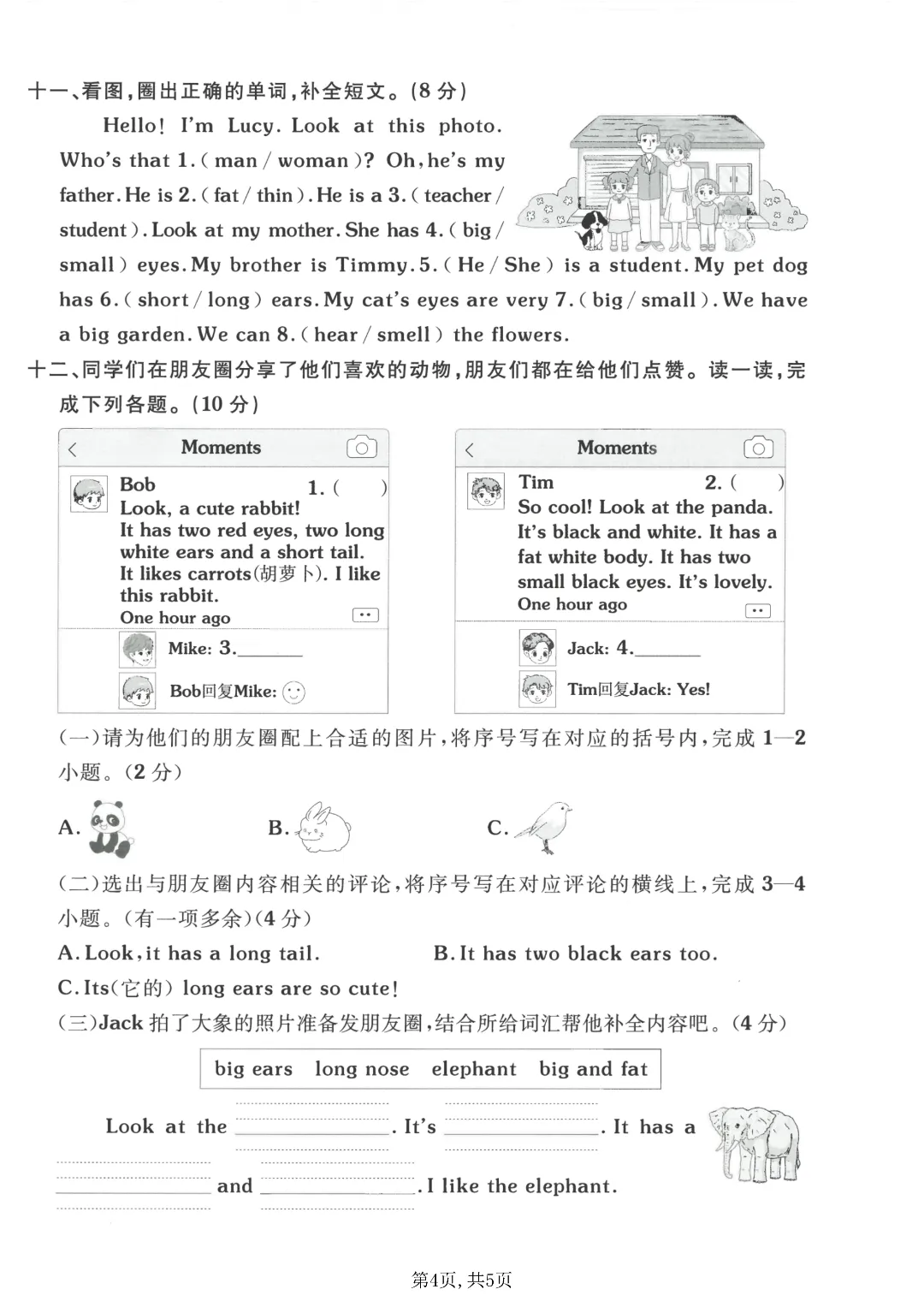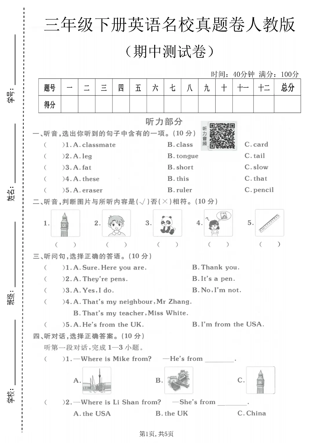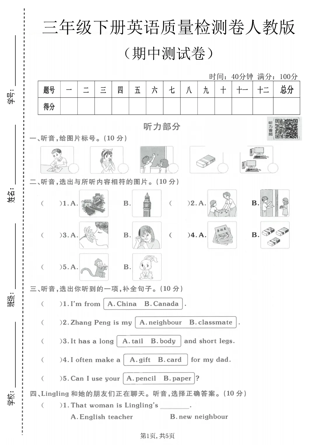 26年春新三年级下册人教PEP版英语《期中考试测试卷3套》附答案‖高清可打印