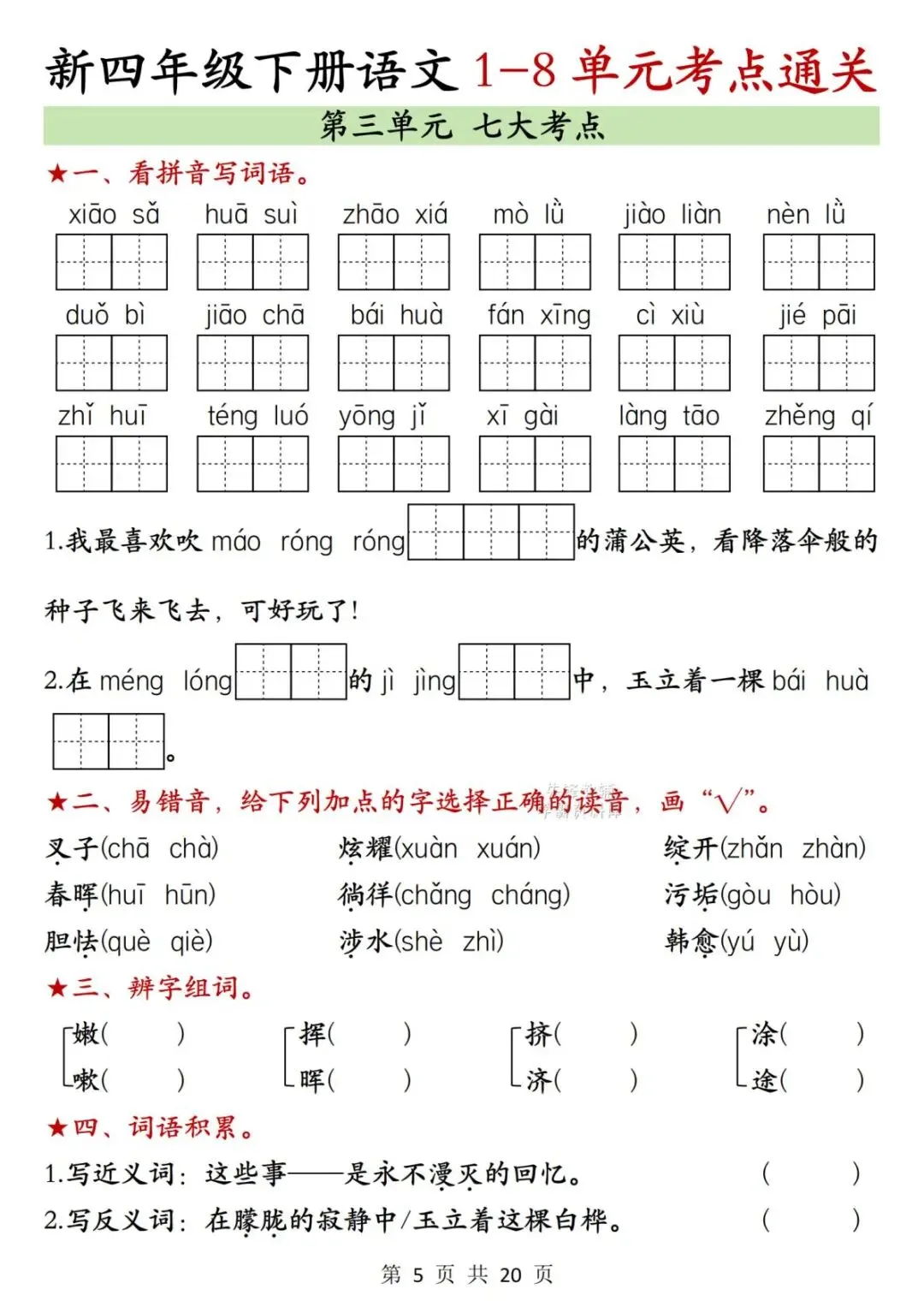 四年级(下)语文1-4单元考点通关(电子版可打印)