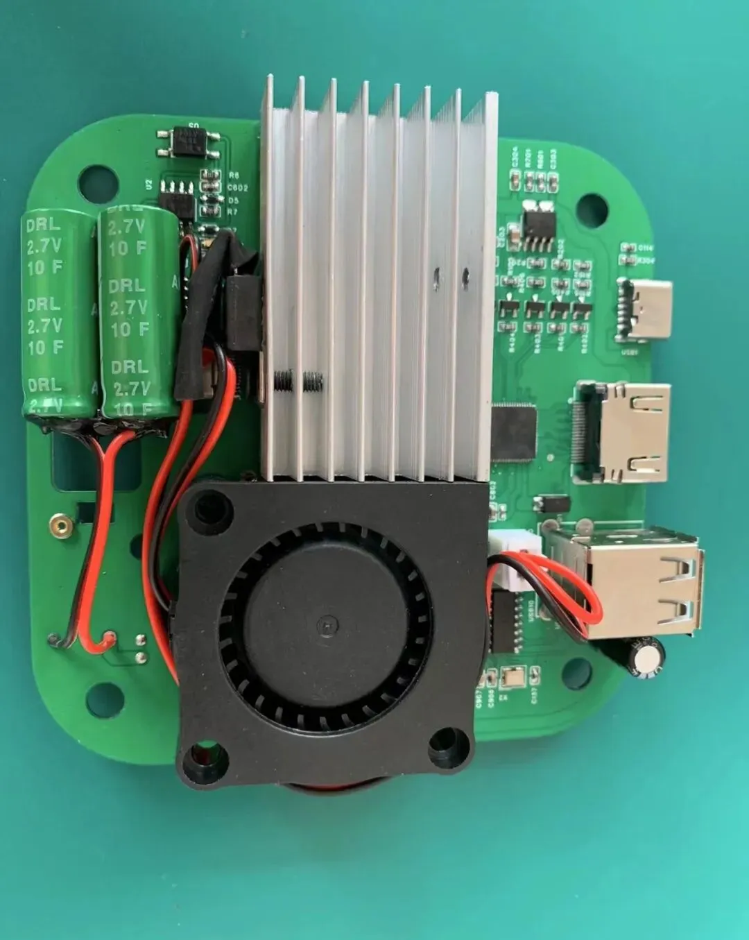 相比常见的三星S20主板改小主机,这个用坚果R1改小主机就漂亮多了,大神居然设计了一套改装套件,定制了一个绿色的PCB板,还加装了电容、涡轮风扇和USB接口。显然,骁龙845处理器就压在涡轮风扇下面,夏天玩游戏的散热应该挺好。