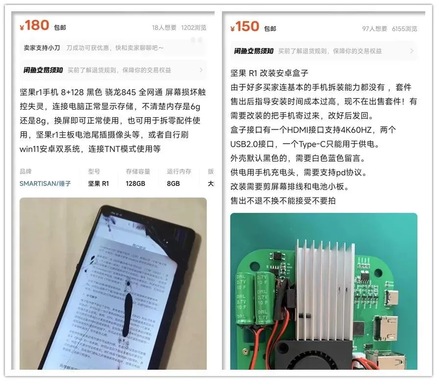 改装成本方面,我查了目前坚果R1的8G+128G碎屏机只要180元包邮,然后改装小主机是150元成本,合计成本是330元。而之前用三星S20主板改的骁龙865小主机是500多元,这个差价也对应骁龙845和骁龙865的性能水平了。