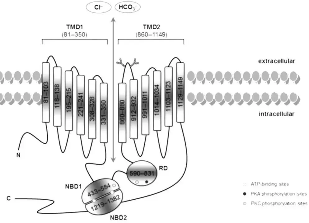 5.囊性纤维化(CF)是白种人群中最常见的危及生命的单基因疾病,由囊性纤维化跨膜传导调节因子(CFTR)基因突变引起。CFTR编码一种阴离子通道,具有两个跨膜结构域(TMDs)、两个核苷酸结合结构域(NBDs)和一个独特的调节结构域(RD),其活性受环磷酸腺苷(cAMP)依赖性蛋白激酶A(PKA)、蛋白激酶C(PKC)和ATP控制。最常见的CFTR突变是∆F508,影响全球约80%的CF患者,该突变导致NBD1的热稳定性和动力学稳定性降低,内质网(ER)保留错误折叠的∆F508-CFTR并通过蛋白酶体迅速降解。CF影响全球约85,000人,主要致死性源于呼吸道疾病,其病理生理包括气道阻塞、炎症和感染,导致上皮损伤、组织重塑和终末期肺病。以下关于CFTR功能描述正确的是()