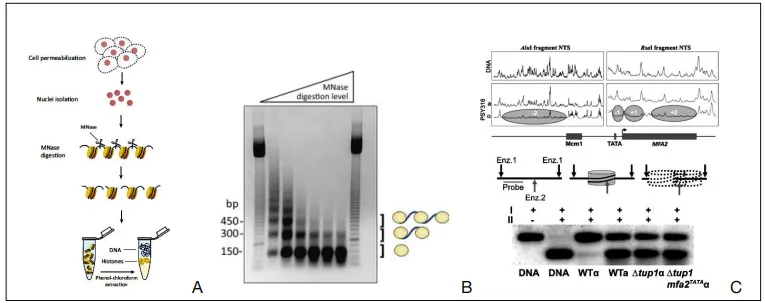 7.核小体是染色质组装的基本结构单位,如图所示,提取细胞核,用非特异性微球菌核酸酶消化染色质,分离组蛋白及其结合的DNA(图A),进行琼脂糖凝胶电泳,发现大多数DNA被降解成大约200bp的片段,或者是部分酶解产生的以200bp为单位的二体、三体(图B)。核小体定位技术发现,酿酒酵母MFA2基因存在4个核小体定位(-1,+1,+2图C上图所示),用限制性内切酶Enz.1(AluI)和Enz.2(RsaI)分别处理MFA2转录活跃野生型酵母细胞DNA(WTα)和MFA2转录抑制野生型酵母细胞DNA(WTα)以及裸露DNA,电泳检测显示如图所示(图C下图所示)。如下描述正确的是()